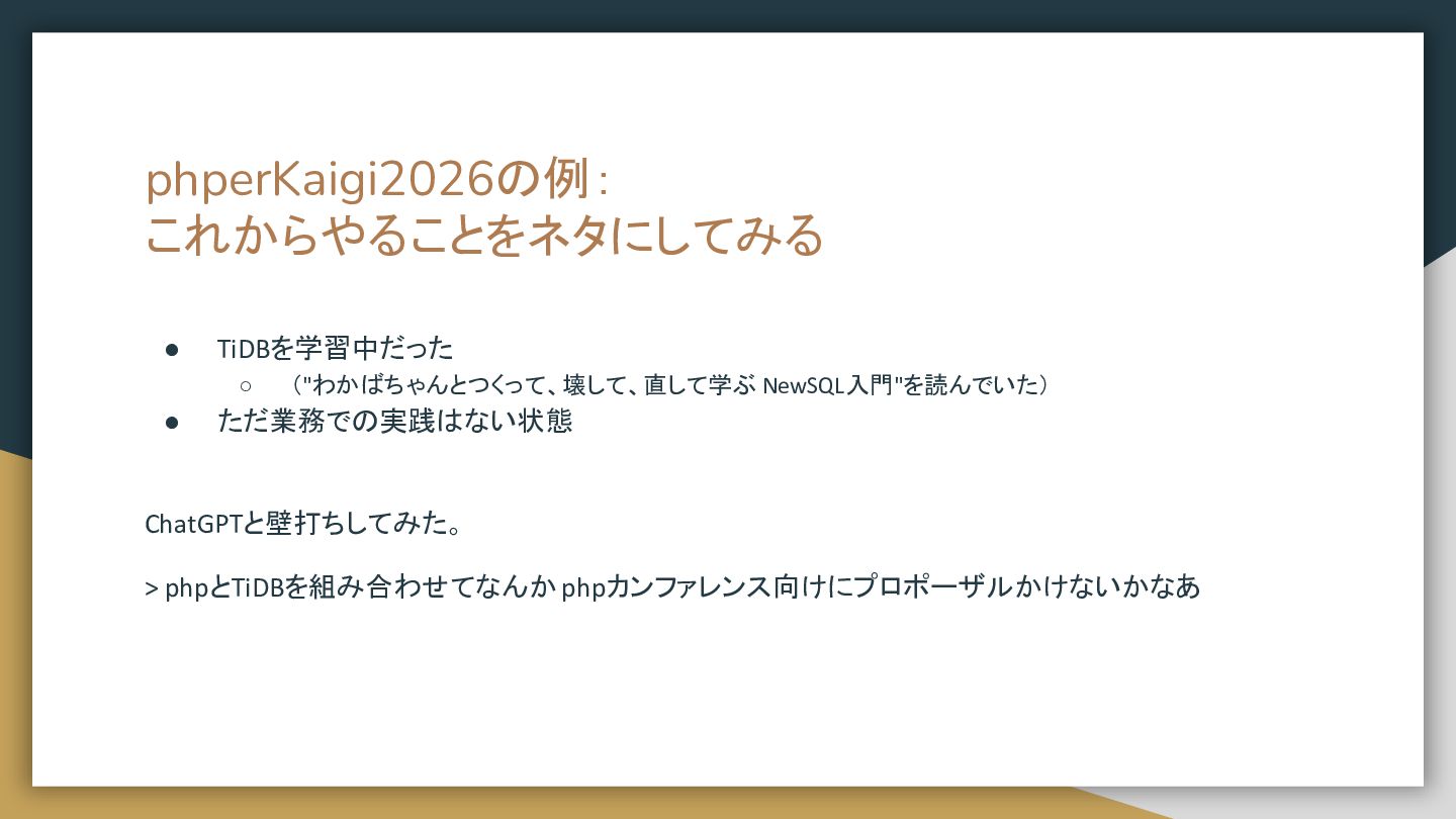 phperKaigi2026の例: これからやることをネタにしてみる • TiDBを学習中だった ◦ ("わかばちゃんとつくって、壊して、直して学ぶ NewSQL入門"を読んでいた) • ただ業務での実践はない状態 ChatGPTと壁打ちしてみた。