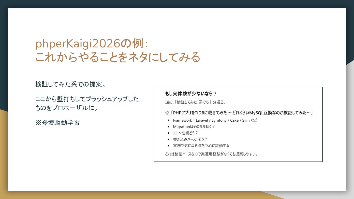 phperKaigi2026の例: これからやることをネタにしてみる 検証してみた系での提案。 ここから壁打ちしてブラッシュアップした ものをプロポーザルに。 ※登壇駆動学習