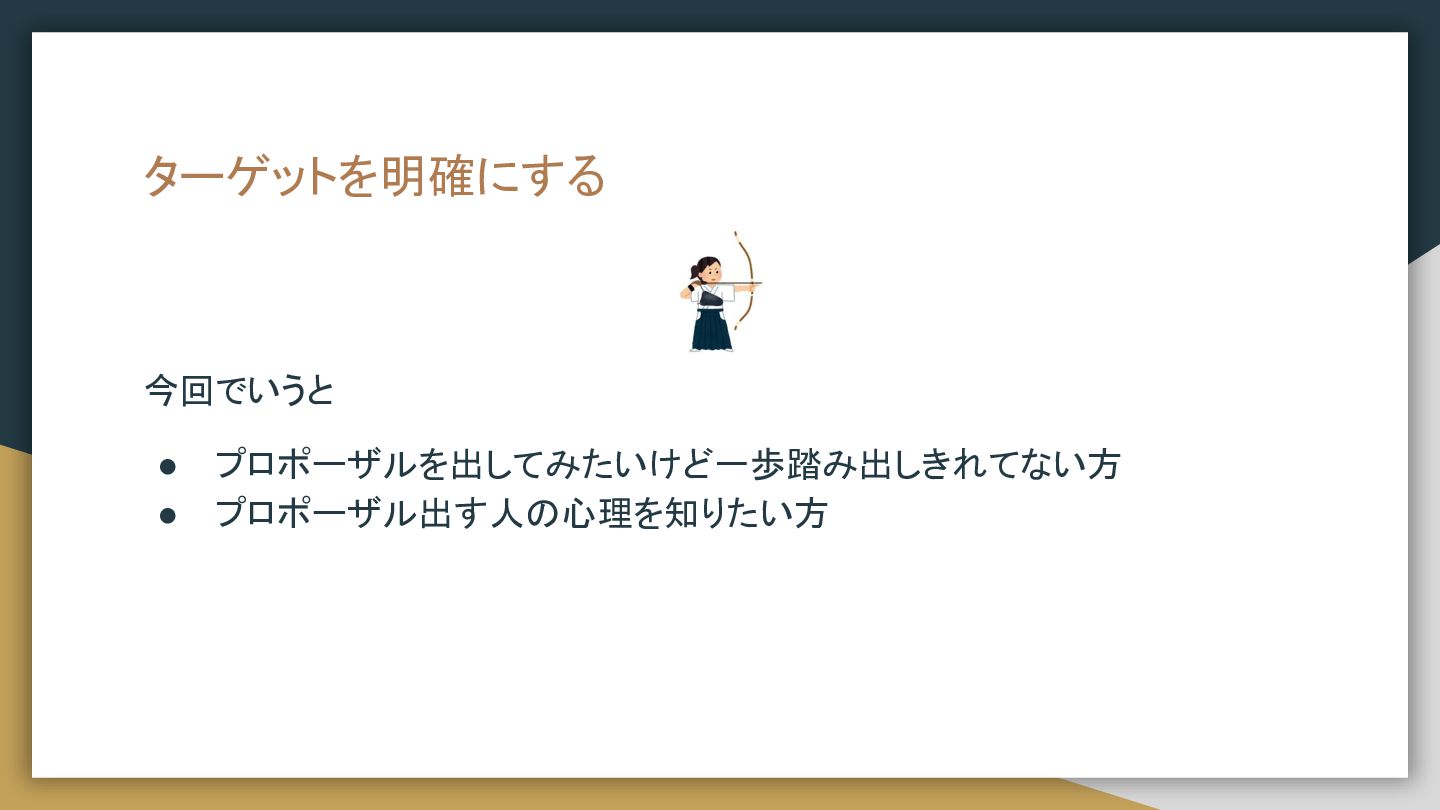 ターゲットを明確にする 今回でいうと • プロポーザルを出してみたいけど一歩踏み出しきれてない方 • プロポーザル出す人の心理を知りたい方