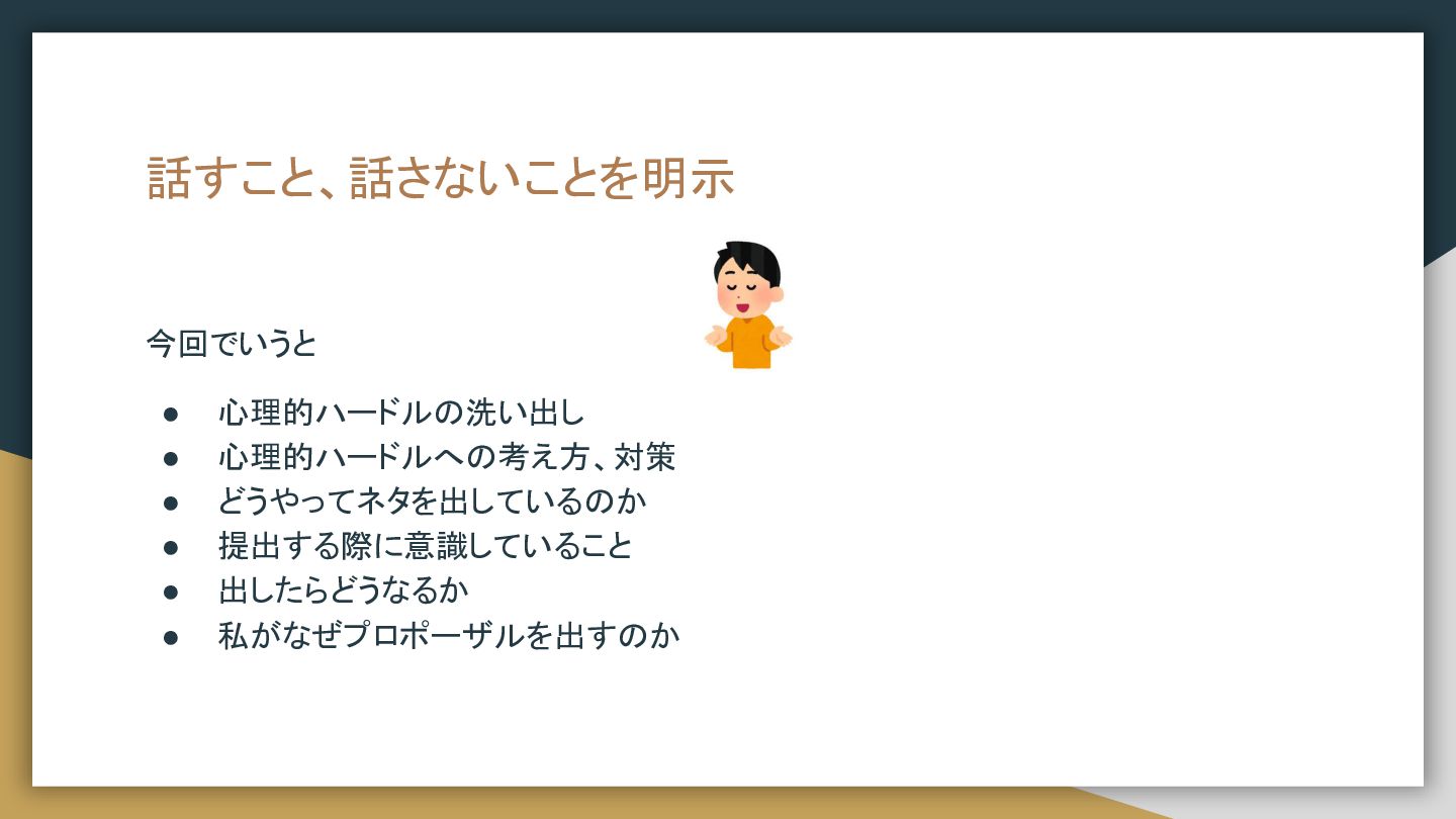 話すこと、話さないことを明示 今回でいうと • 心理的ハードルの洗い出し • 心理的ハードルへの考え方、対策 • どうやってネタを出しているのか • 提出する際に意識していること