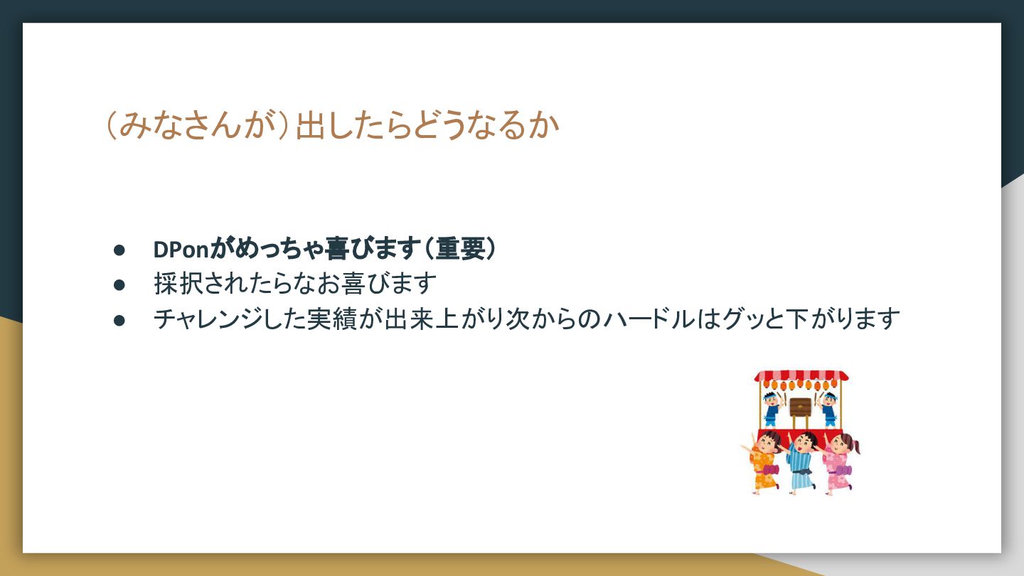 (みなさんが)出したらどうなるか • DPonがめっちゃ喜びます(重要) • 採択されたらなお喜びます • チャレンジした実績が出来上がり次からのハードルはグッと下がります