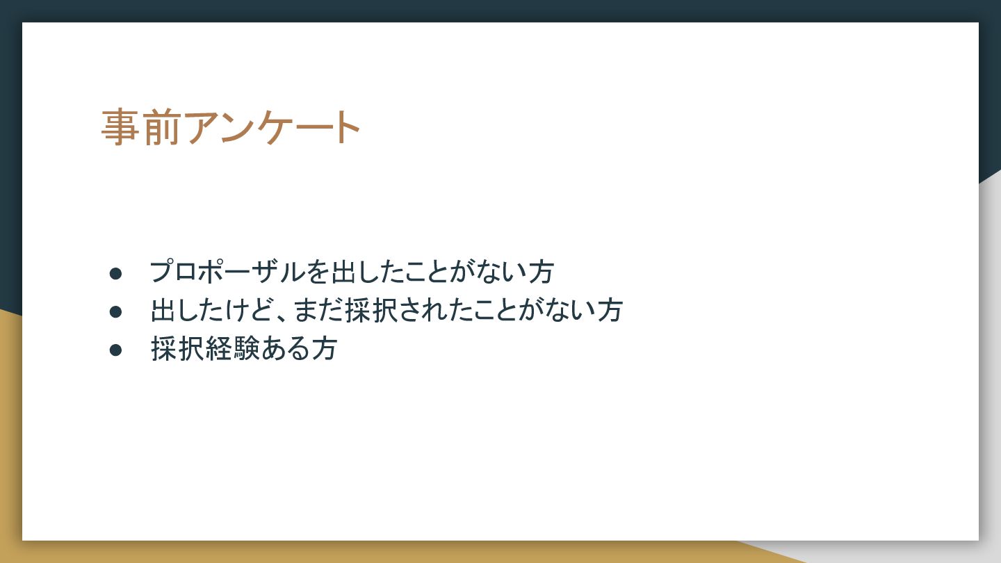 事前アンケート • プロポーザルを出したことがない方 • 出したけど、まだ採択されたことがない方 • 採択経験ある方