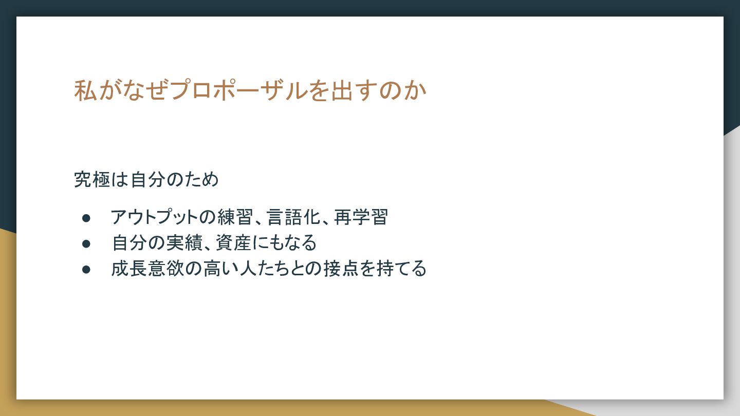 私がなぜプロポーザルを出すのか 究極は自分のため • アウトプットの練習、言語化、再学習 • 自分の実績、資産にもなる • 成長意欲の高い人たちとの接点を持てる