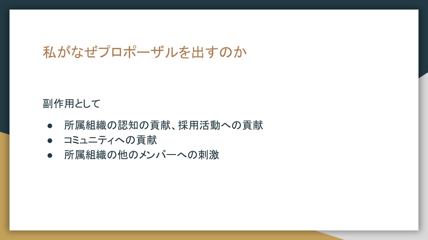私がなぜプロポーザルを出すのか 副作用として • 所属組織の認知の貢献、採用活動への貢献 • コミュニティへの貢献 • 所属組織の他のメンバーへの刺激
