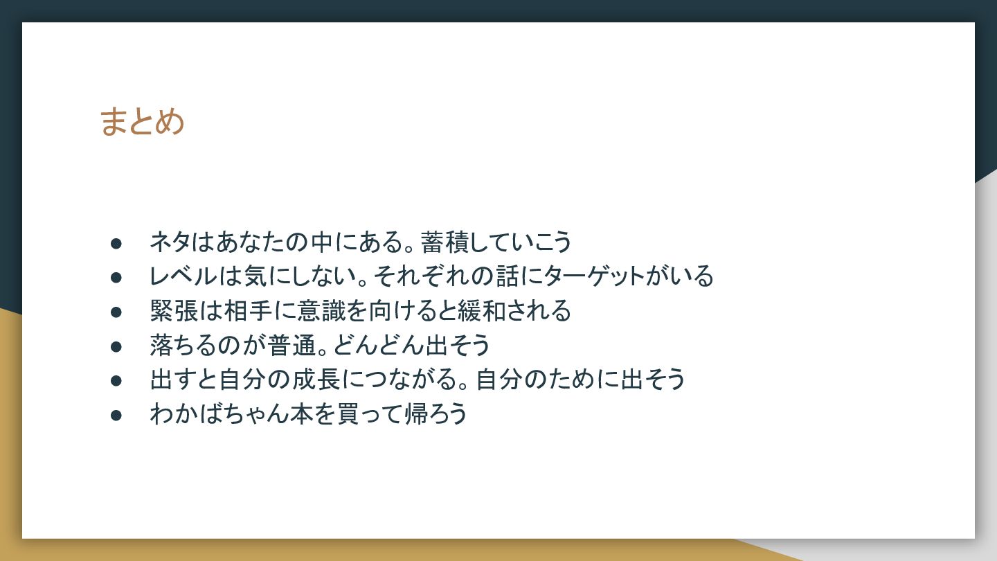 まとめ • ネタはあなたの中にある。蓄積していこう • レベルは気にしない。それぞれの話にターゲットがいる • 緊張は相手に意識を向けると緩和される • 落ちるのが普通。どんどん出そう •
