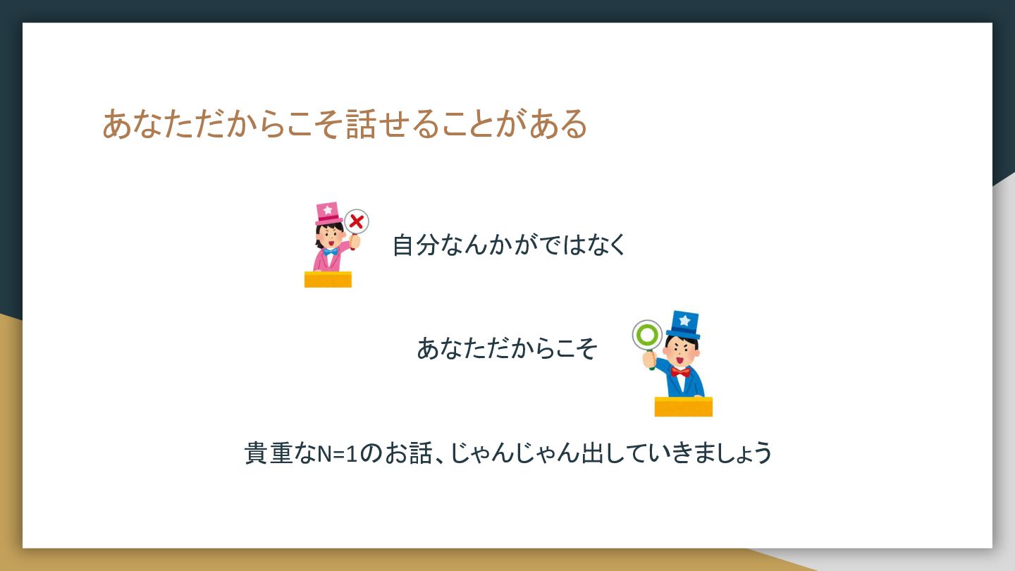 あなただからこそ話せることがある 自分なんかがではなく あなただからこそ 貴重なN=1のお話、じゃんじゃん出していきましょう