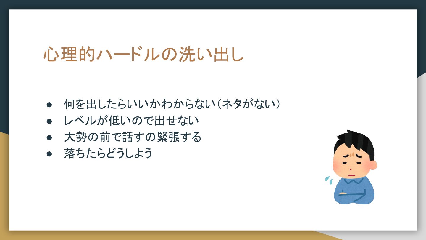 心理的ハードルの洗い出し • 何を出したらいいかわからない(ネタがない) • レベルが低いので出せない • 大勢の前で話すの緊張する • 落ちたらどうしよう