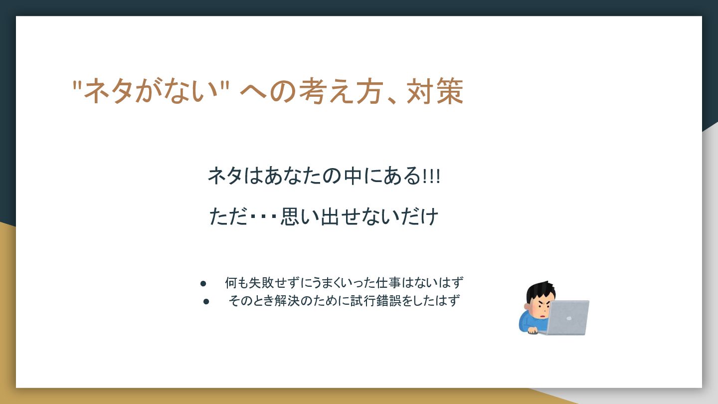 "ネタがない" への考え方、対策 ネタはあなたの中にある!!! ただ・・・思い出せないだけ • 何も失敗せずにうまくいった仕事はないはず • そのとき解決のために試行錯誤をしたはず