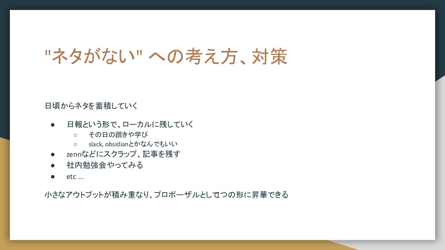 "ネタがない" への考え方、対策 日頃からネタを蓄積していく • 日報という形で、ローカルに残していく ◦ その日の躓きや学び ◦ slack, obsidianとかなんでもいい