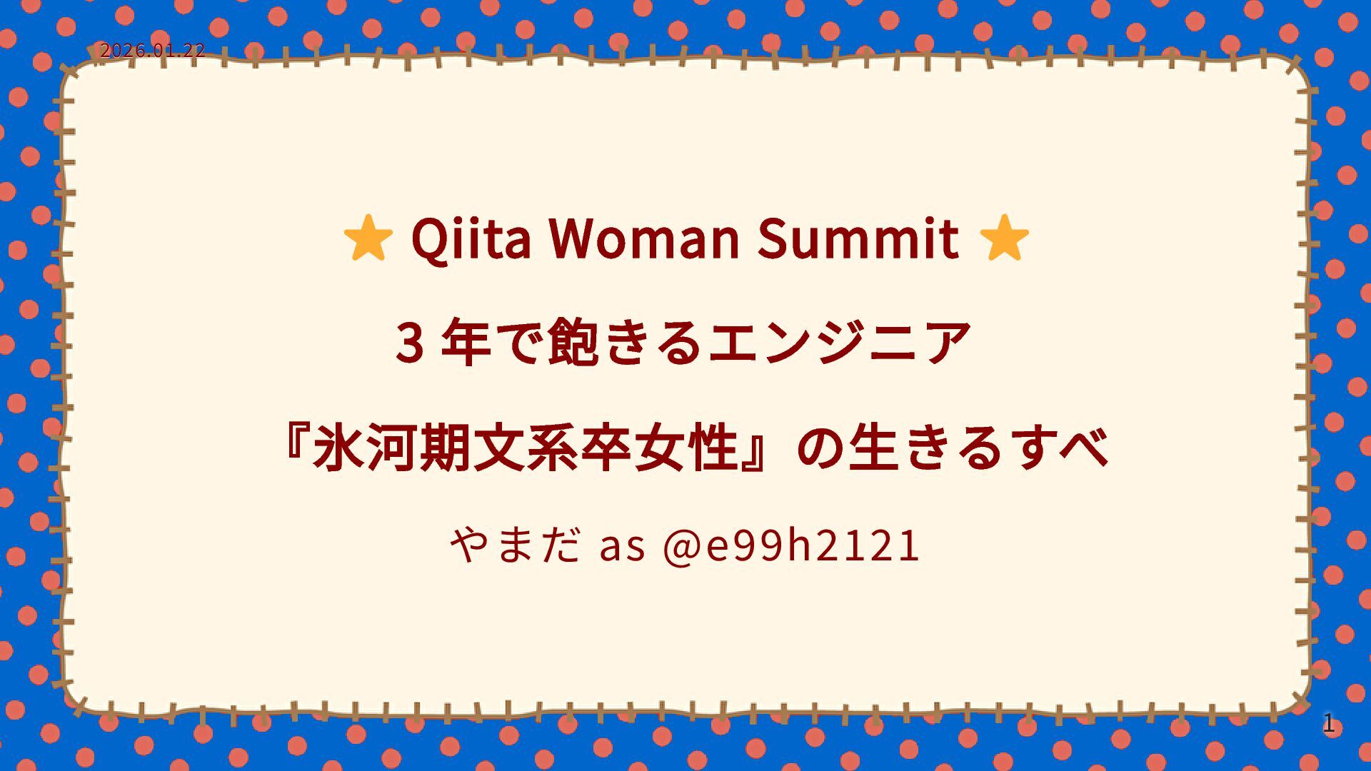 Qiita Woman Summit 3 年で飽きるエンジニア 『氷河期文系卒女性』の生きるすべ やまだ as @e99h2121 2026.01.22