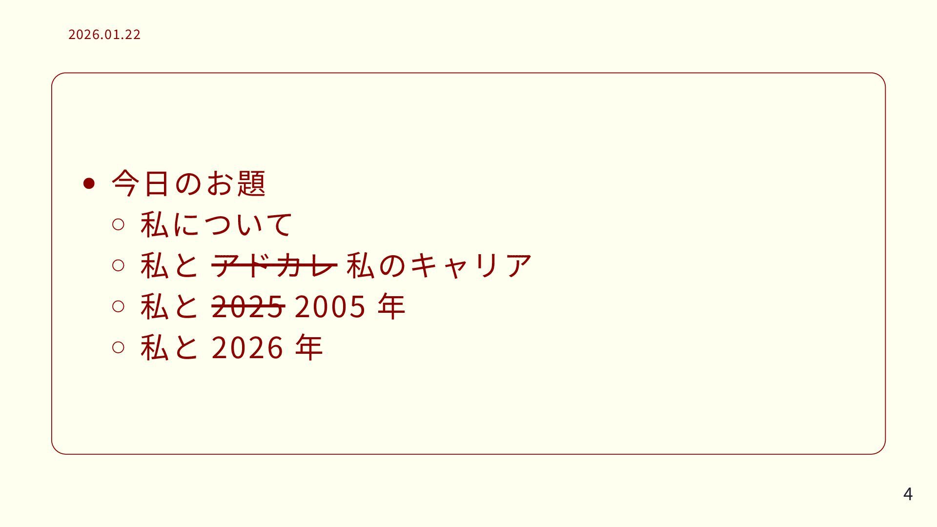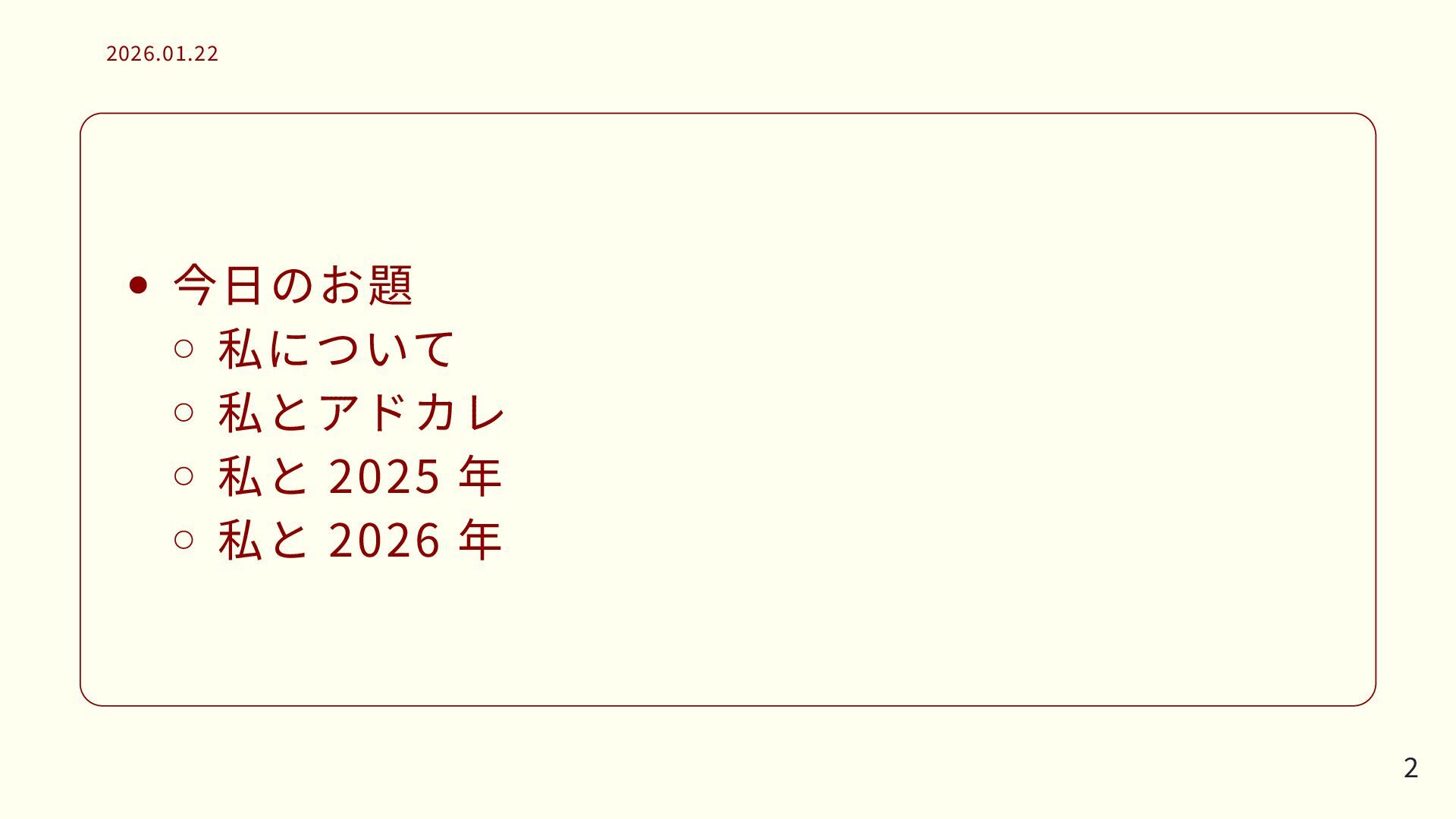 今日のお題 私について 私とアドカレ 私と 2025 年 私と 2026 年 2