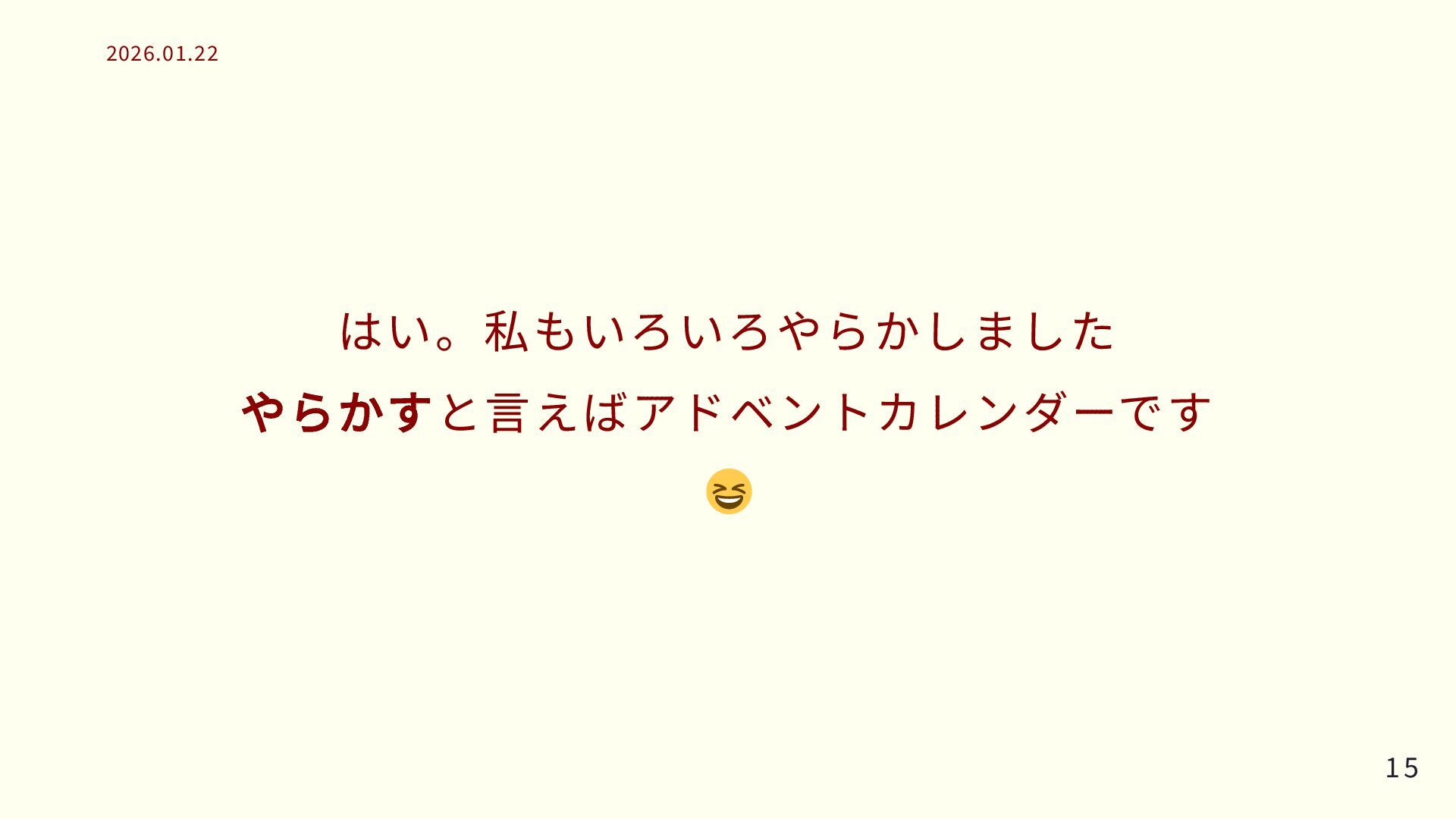 はい。私もいろいろやらかしました やらかすと言えばアドベントカレンダーです 15 15 2026.01.22 2026.01.22