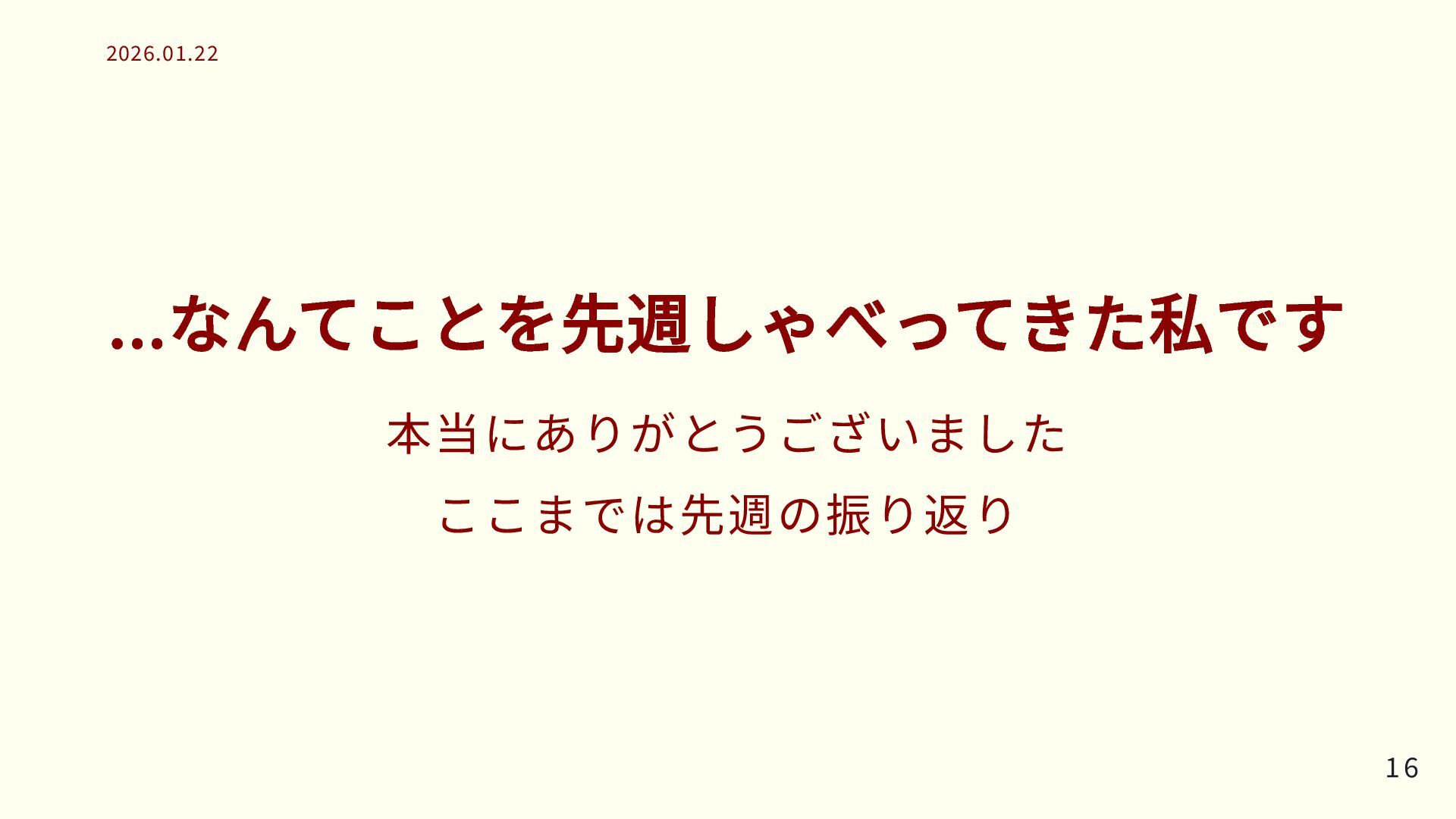 ...なんてことを先週しゃべってきた私です 本当にありがとうございました ここまでは先週の振り返り 16 16 2026.01.22 2026.01.22