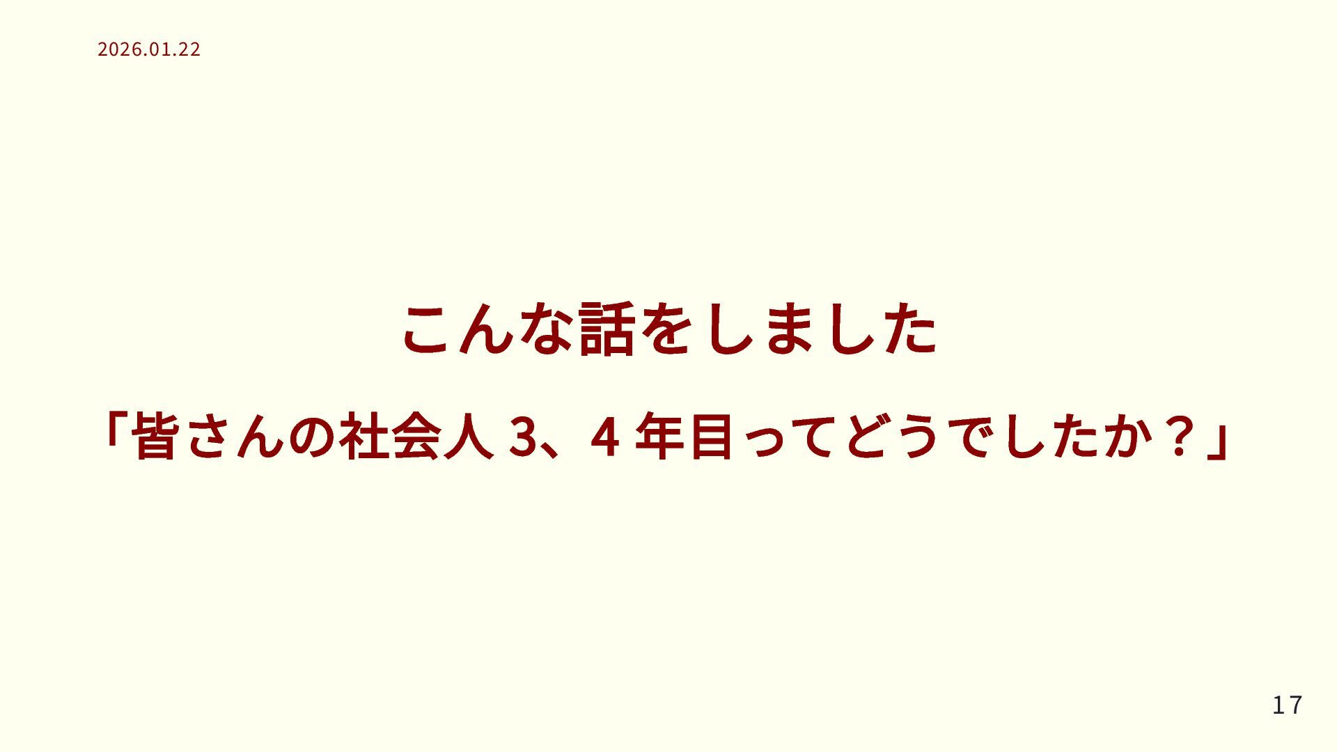 こんな話をしました 「皆さんの社会人 3、4 年目ってどうでしたか?」 17 17 2026.01.22 2026.01.22