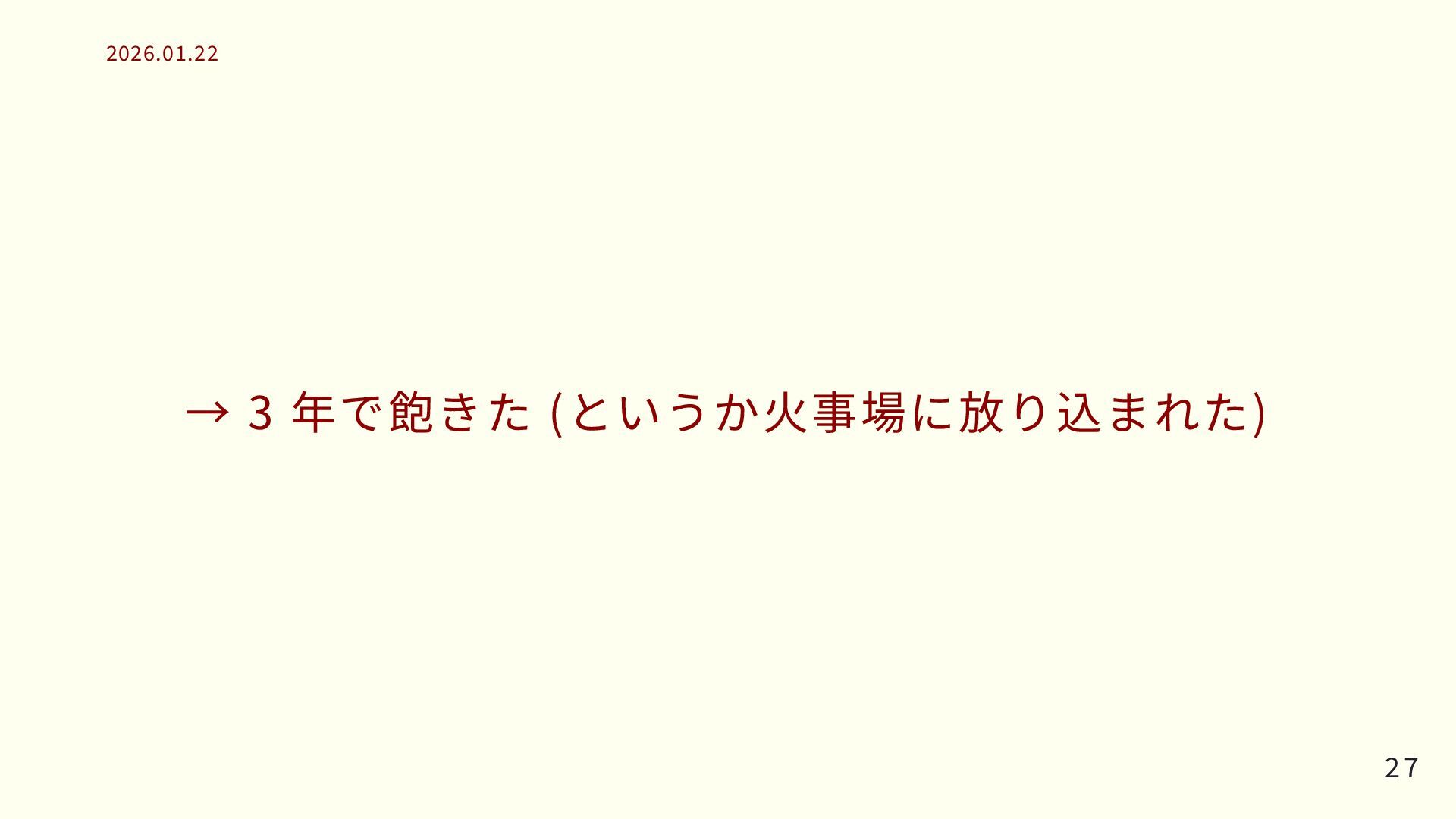 → 3 年で飽きた (というか火事場に放り込まれた) 27 27 2026.01.22 2026.01.22