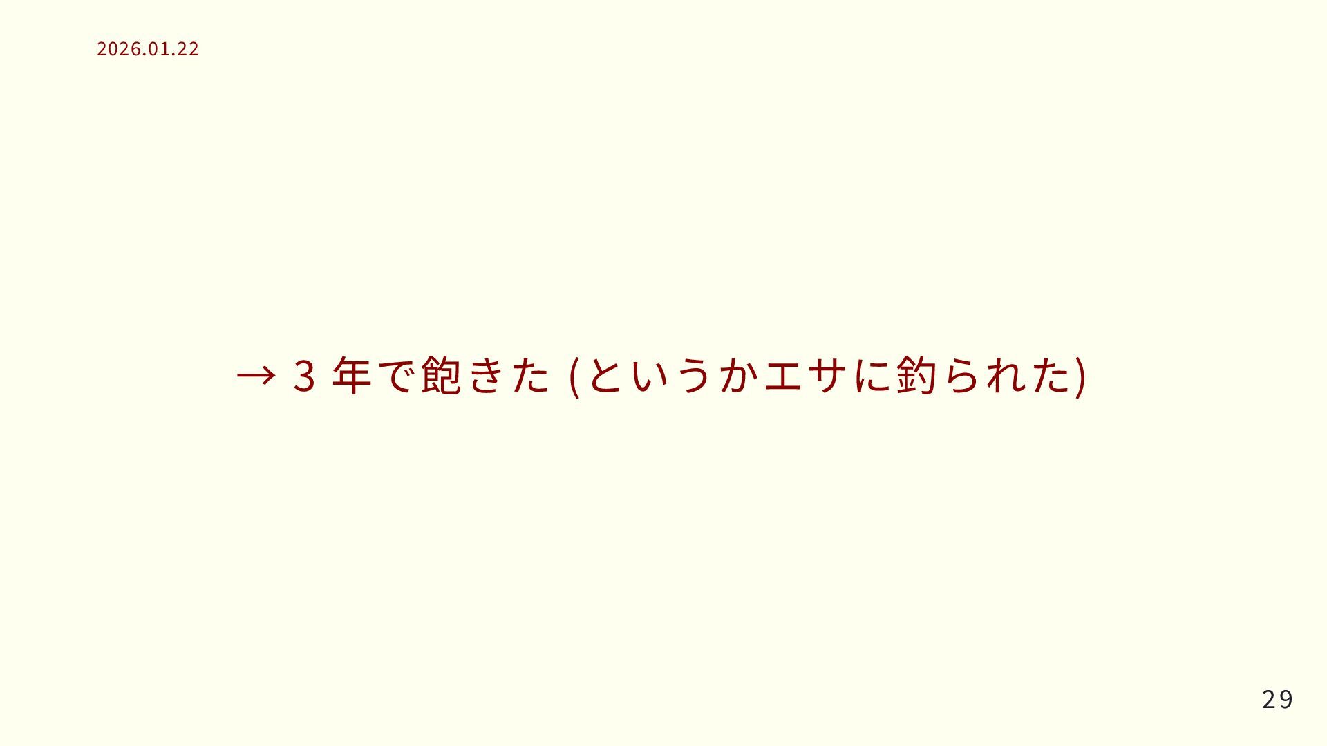 → 3 年で飽きた (というかエサに釣られた) 29 29 2026.01.22 2026.01.22
