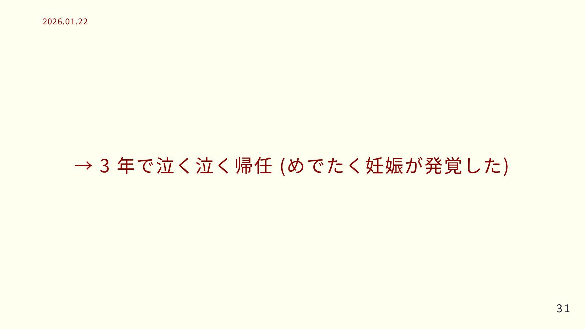 → 3 年で泣く泣く帰任 (めでたく妊娠が発覚した) 31 31 2026.01.22 2026.01.22