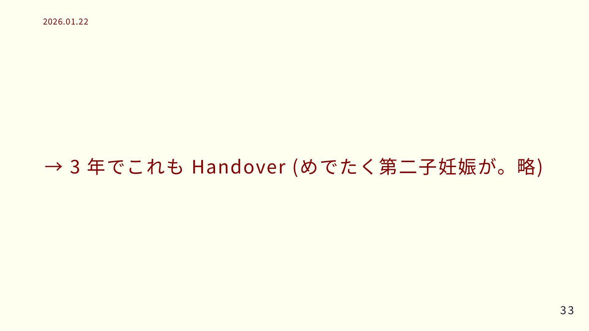 → 3 年でこれも Handover (めでたく第二子妊娠が。略) 33 33 2026.01.22 2026.01.22