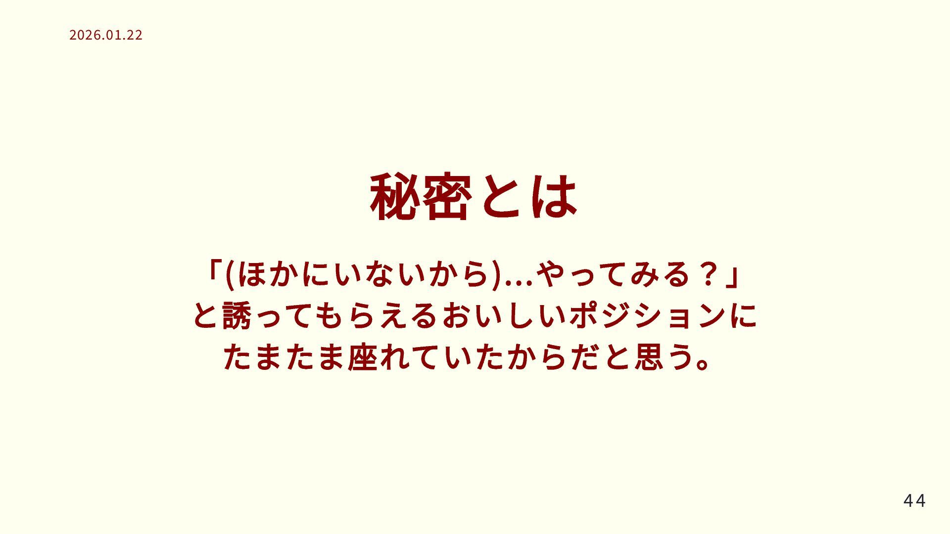 秘密とは 「(ほかにいないから)...やってみる?」 と誘ってもらえるおいしいポジションに たまたま座れていたからだと思う。 44 44 2026.01.22 2026.01.22