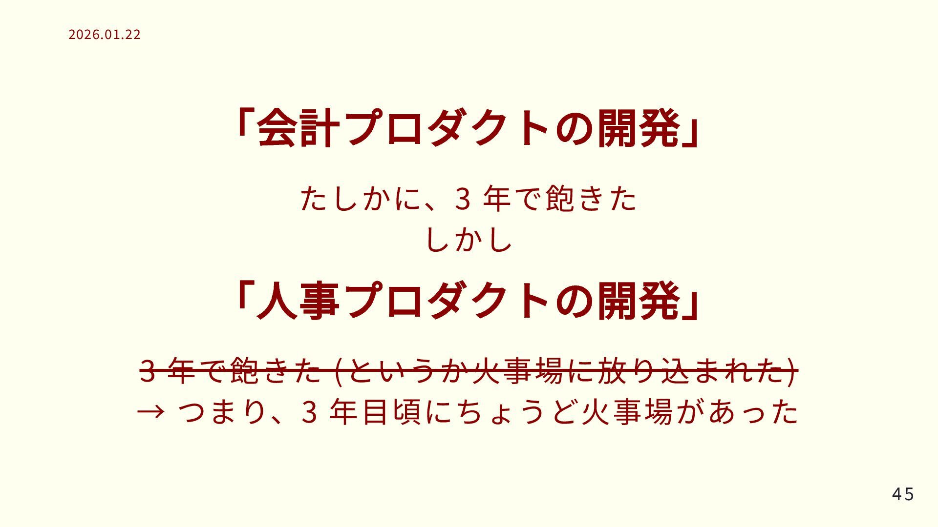 「会計プロダクトの開発」 たしかに、3 年で飽きた しかし 「人事プロダクトの開発」 3 年で飽きた (というか火事場に放り込まれた) → つまり、3