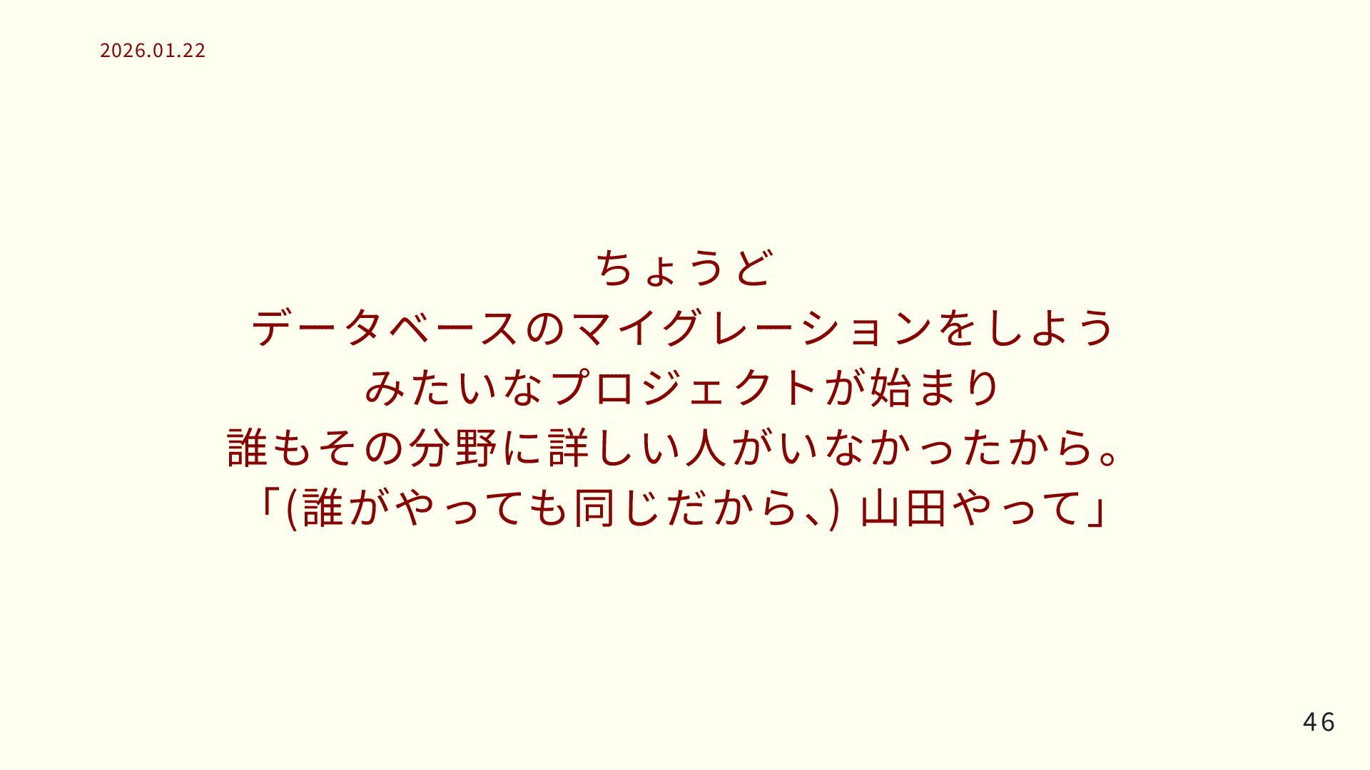 ちょうど データベースのマイグレーションをしよう みたいなプロジェクトが始まり 誰もその分野に詳しい人がいなかったから。 「(誰がやっても同じだから、 ) 山田やって」 46 46 2026.01.22