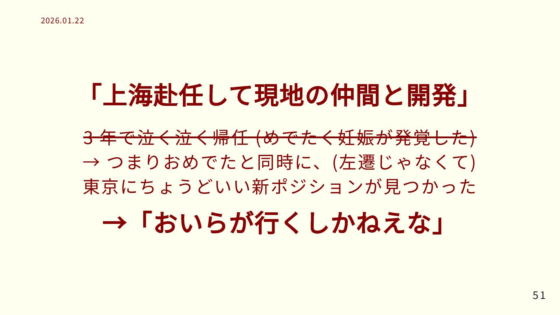 「上海赴任して現地の仲間と開発」 3 年で泣く泣く帰任 (めでたく妊娠が発覚した) → つまりおめでたと同時に、(左遷じゃなくて) 東京にちょうどいい新ポジションが見つかった →「おいらが行くしかねえな」 51 51