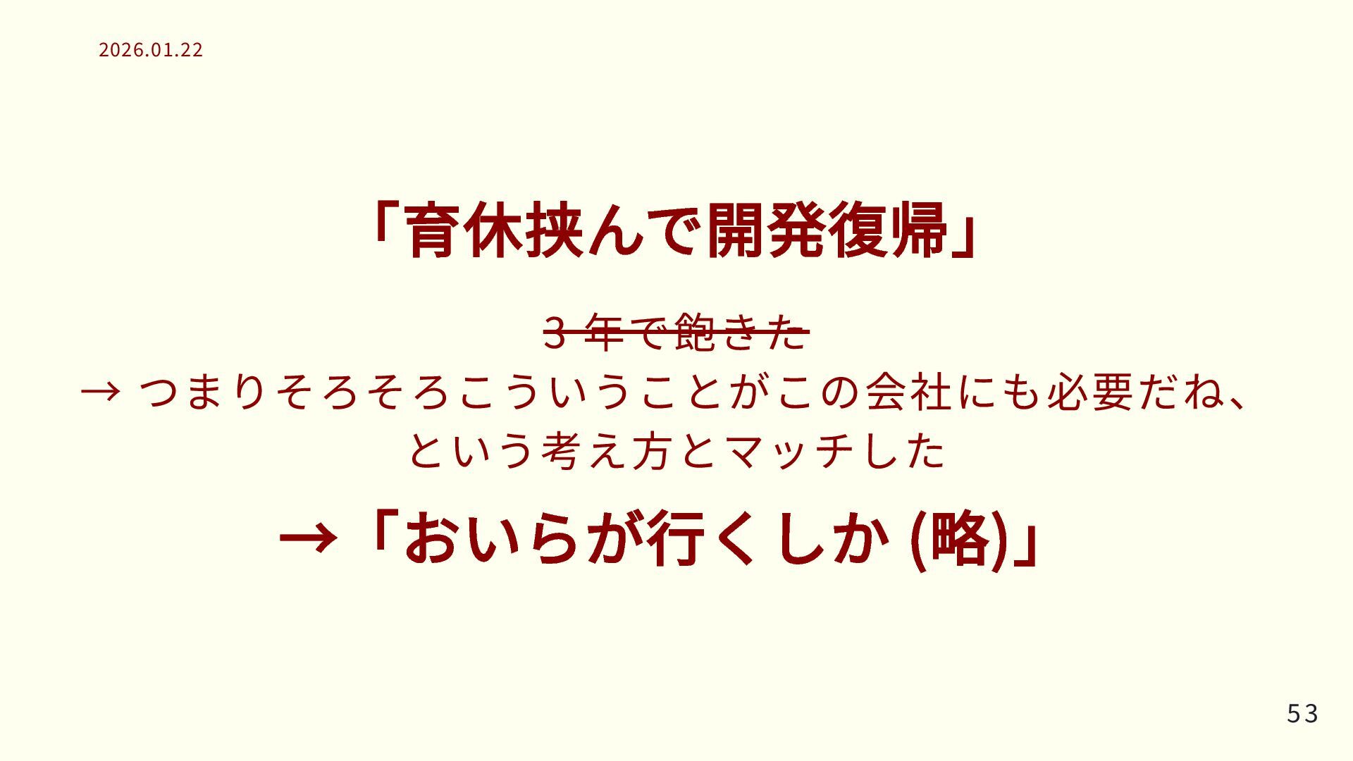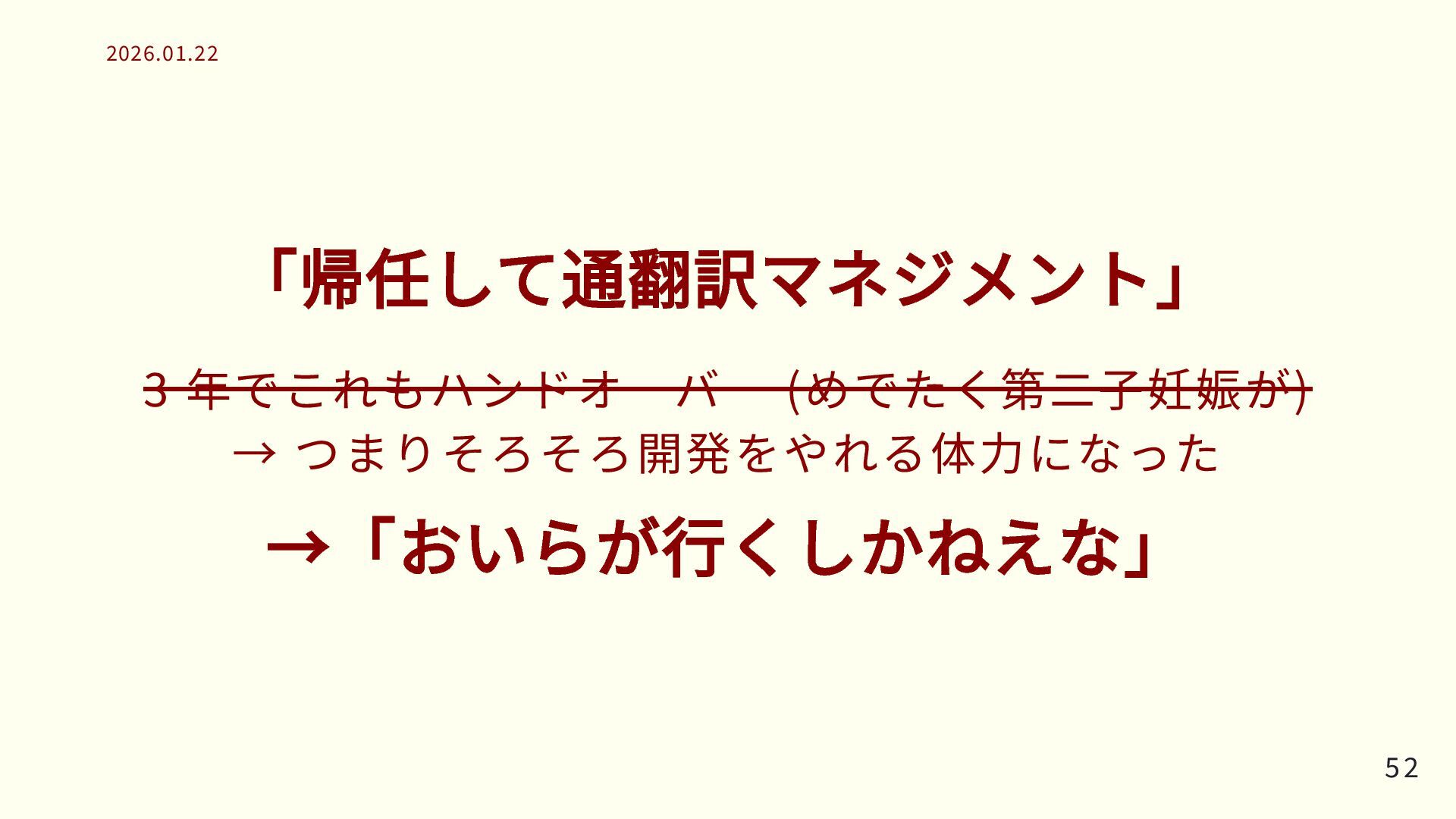 「帰任して通翻訳マネジメント」 3 年でこれもハンドオーバー (めでたく第二子妊娠が) → つまりそろそろ開発をやれる体力になった →「おいらが行くしかねえな」 52 52 2026.01.22