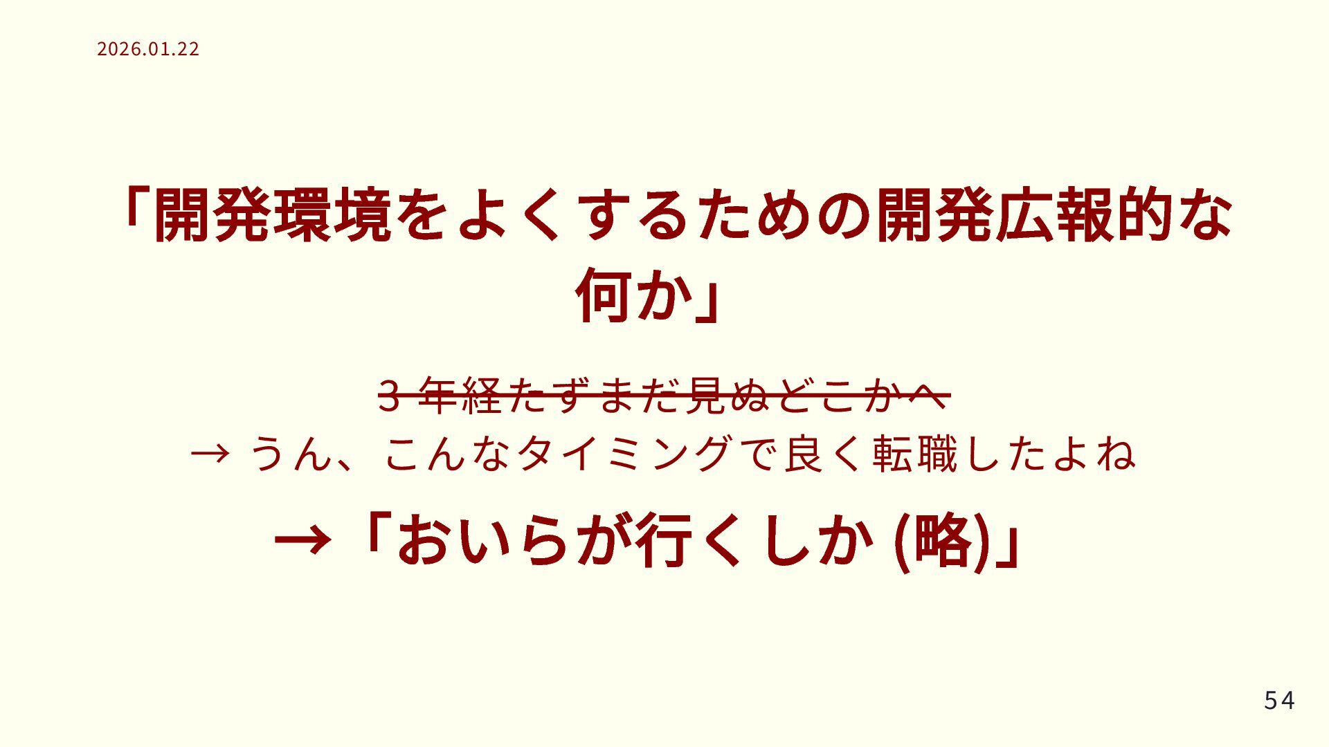 「開発環境をよくするための開発広報的な 何か」 3 年経たずまだ見ぬどこかへ → うん、こんなタイミングで良く転職したよね →「おいらが行くしか (略)」 54 54