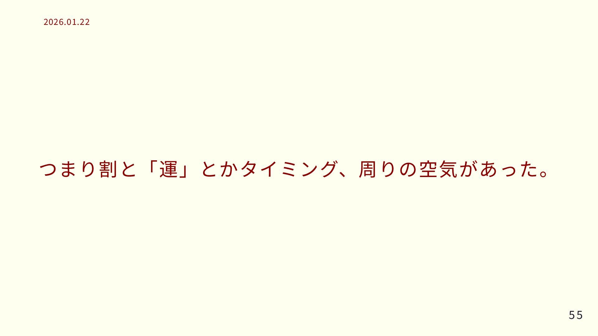 つまり割と「運」とかタイミング、周りの空気があった。 55 55 2026.01.22 2026.01.22