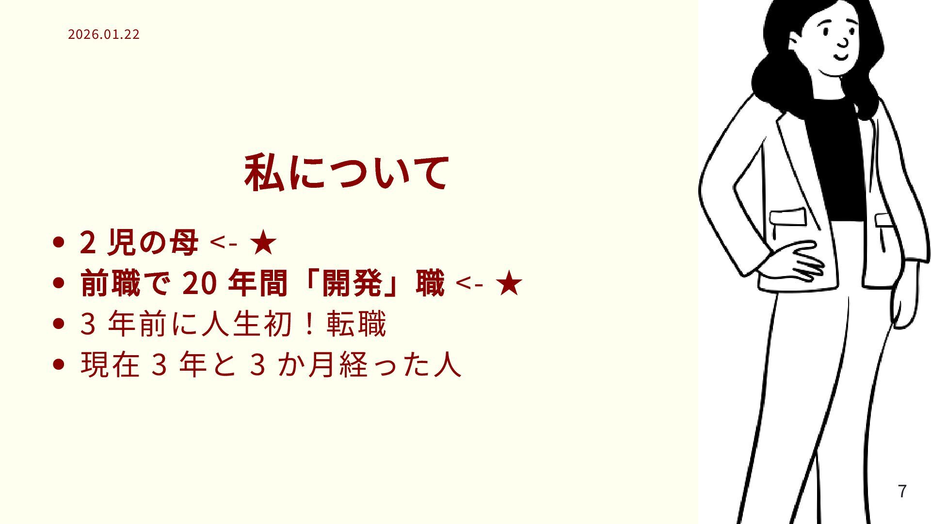私について 2 児の母 <- ★ 前職で 20 年間「開発」職 <- ★