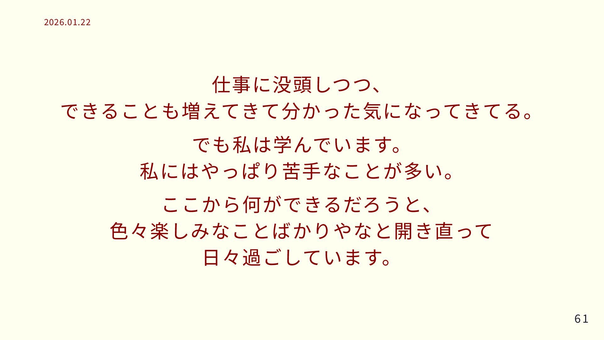 仕事に没頭しつつ、 できることも増えてきて分かった気になってきてる。 でも私は学んでいます。 私にはやっぱり苦手なことが多い。 ここから何ができるだろうと、 色々楽しみなことばかりやなと開き直って 日々過ごしています。 61 61 2026.01.22