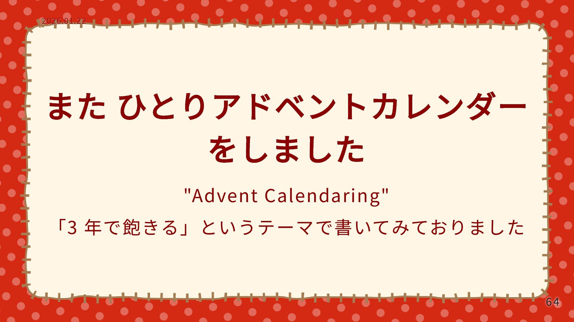また ひとりアドベントカレンダー をしました "Advent Calendaring" 「3 年で飽きる」というテーマで書いてみておりました 2026.01.22 2026.01.22 64