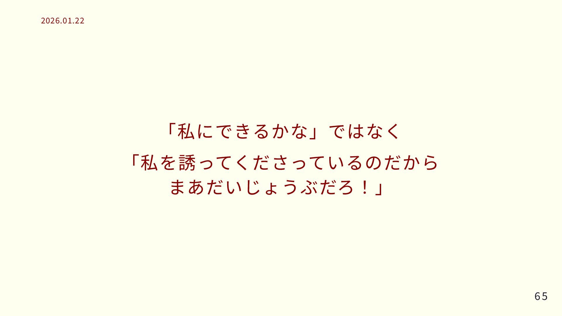 「私にできるかな」ではなく 「私を誘ってくださっているのだから まあだいじょうぶだろ!」 65 65 2026.01.22 2026.01.22