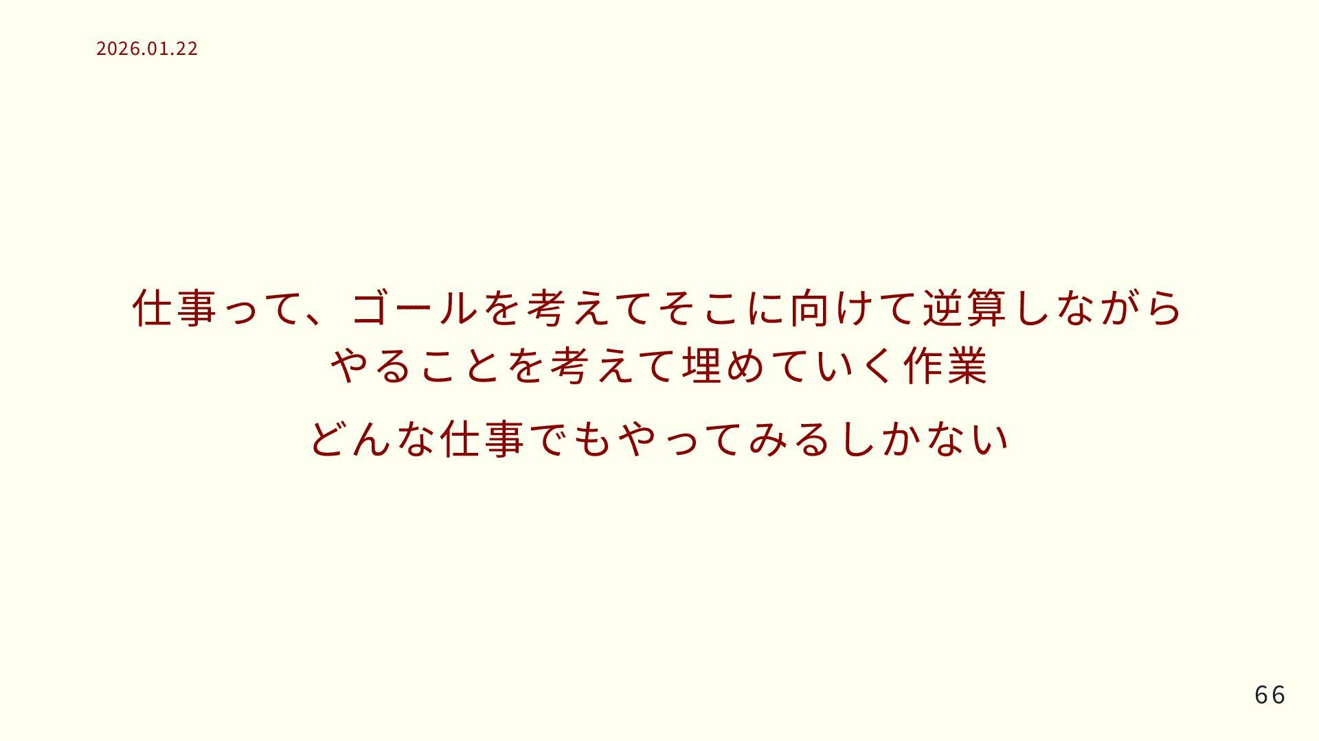 仕事って、ゴールを考えてそこに向けて逆算しながら やることを考えて埋めていく作業 どんな仕事でもやってみるしかない 66 66 2026.01.22 2026.01.22