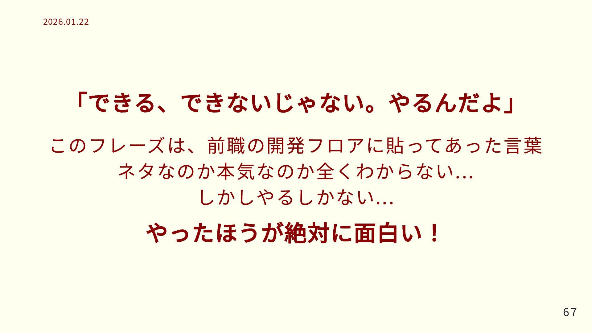 「できる、できないじゃない。やるんだよ」 このフレーズは、前職の開発フロアに貼ってあった言葉 ネタなのか本気なのか全くわからない... しかしやるしかない... やったほうが絶対に面白い! 67 67 2026.01.22 2026.01.22