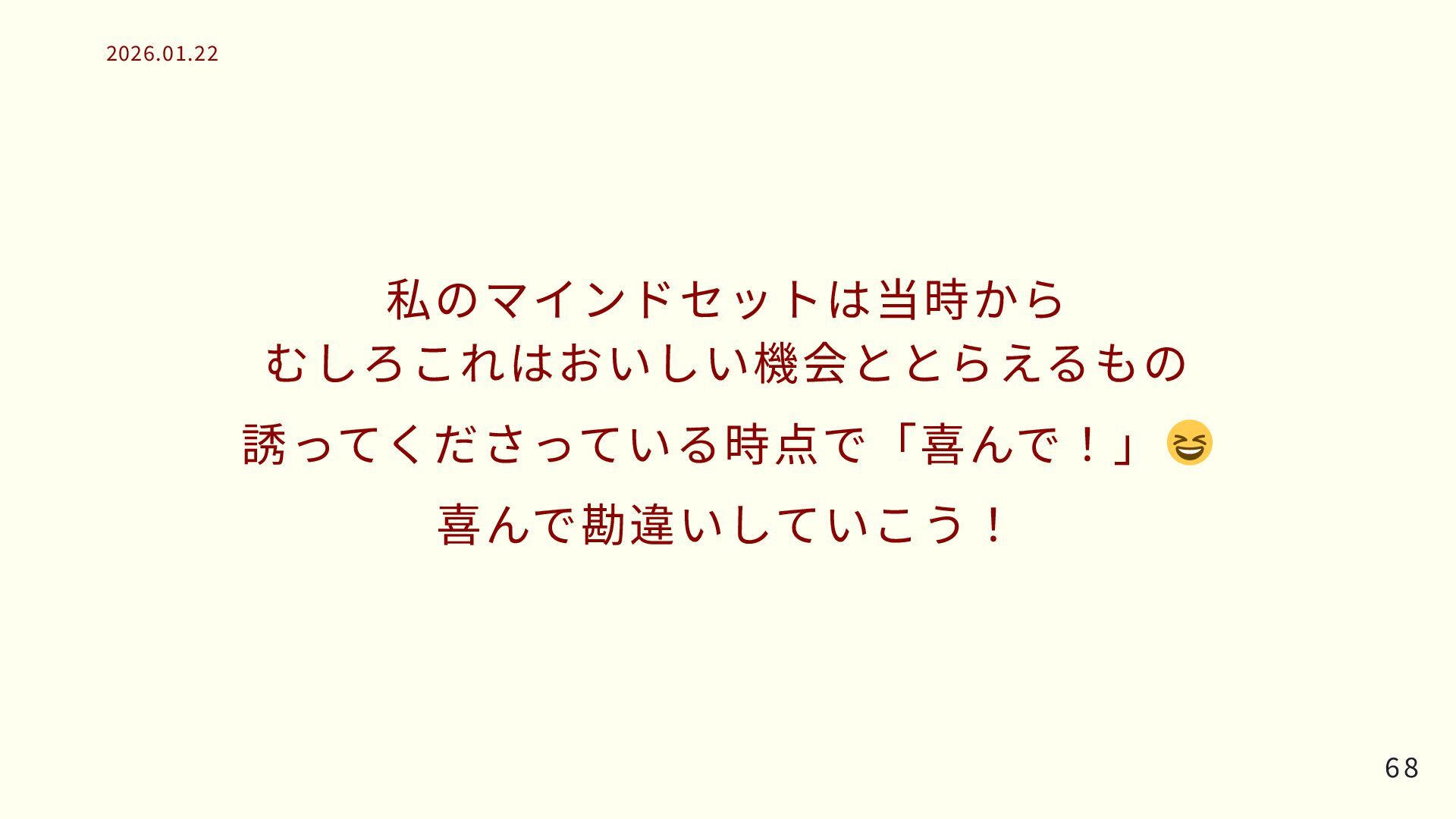 私のマインドセットは当時から むしろこれはおいしい機会ととらえるもの 誘ってくださっている時点で「喜んで!」 喜んで勘違いしていこう! 68 68 2026.01.22 2026.01.22