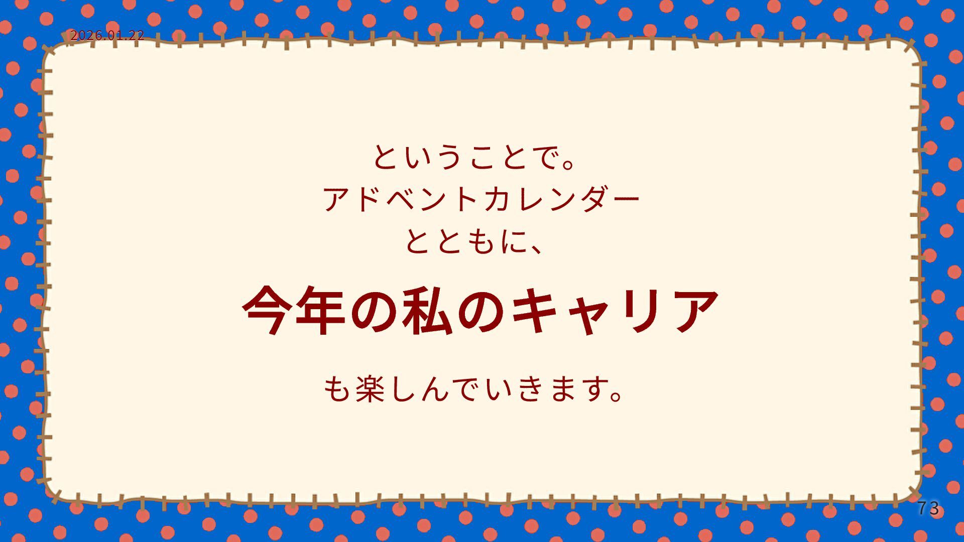 ということで。 アドベントカレンダー とともに、 今年の私のキャリア も楽しんでいきます。 2026.01.22 2026.01.22 73 73