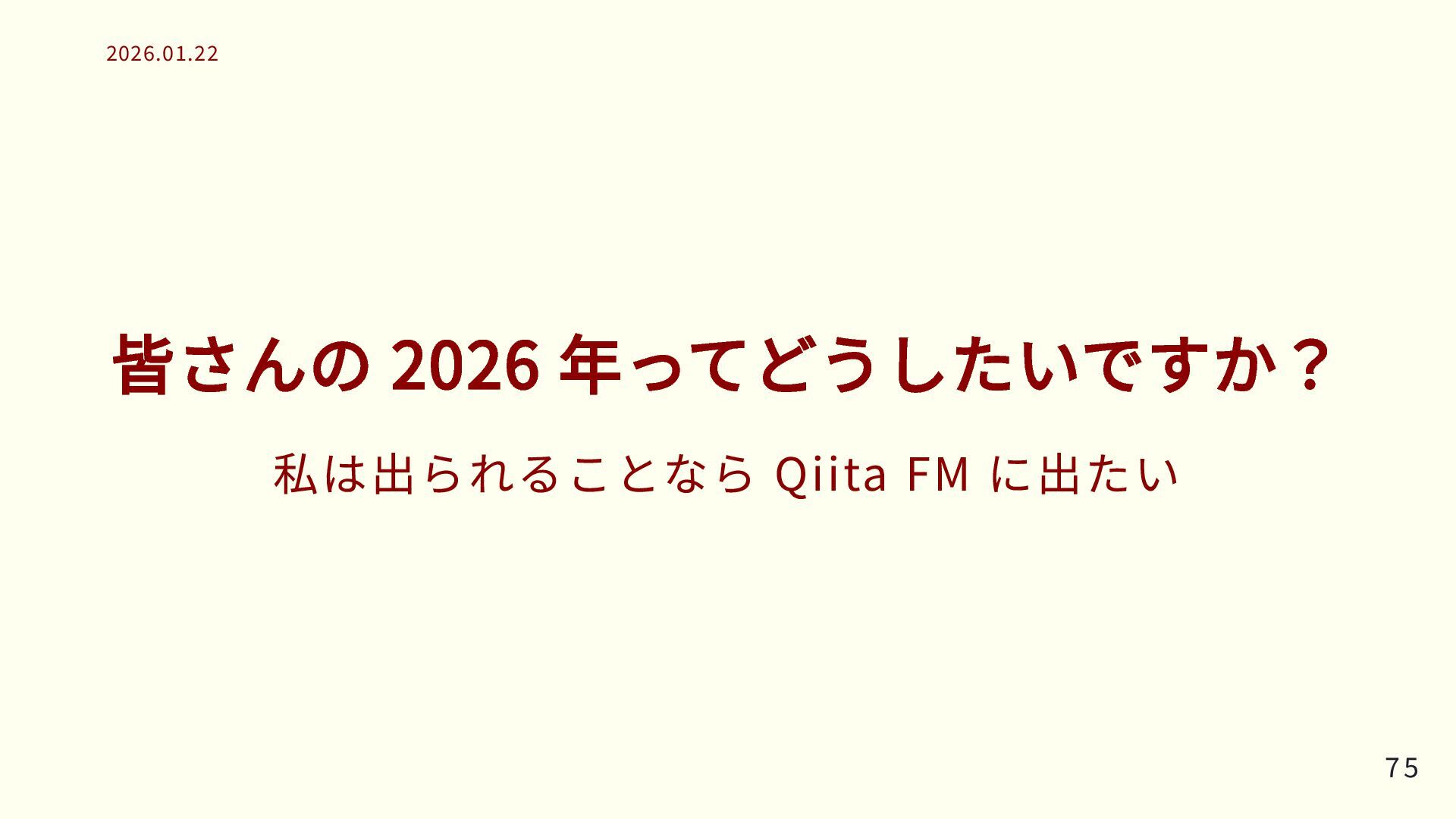 皆さんの 2026 年ってどうしたいですか? 私は出られることなら Qiita FM に出たい 75 75 2026.01.22