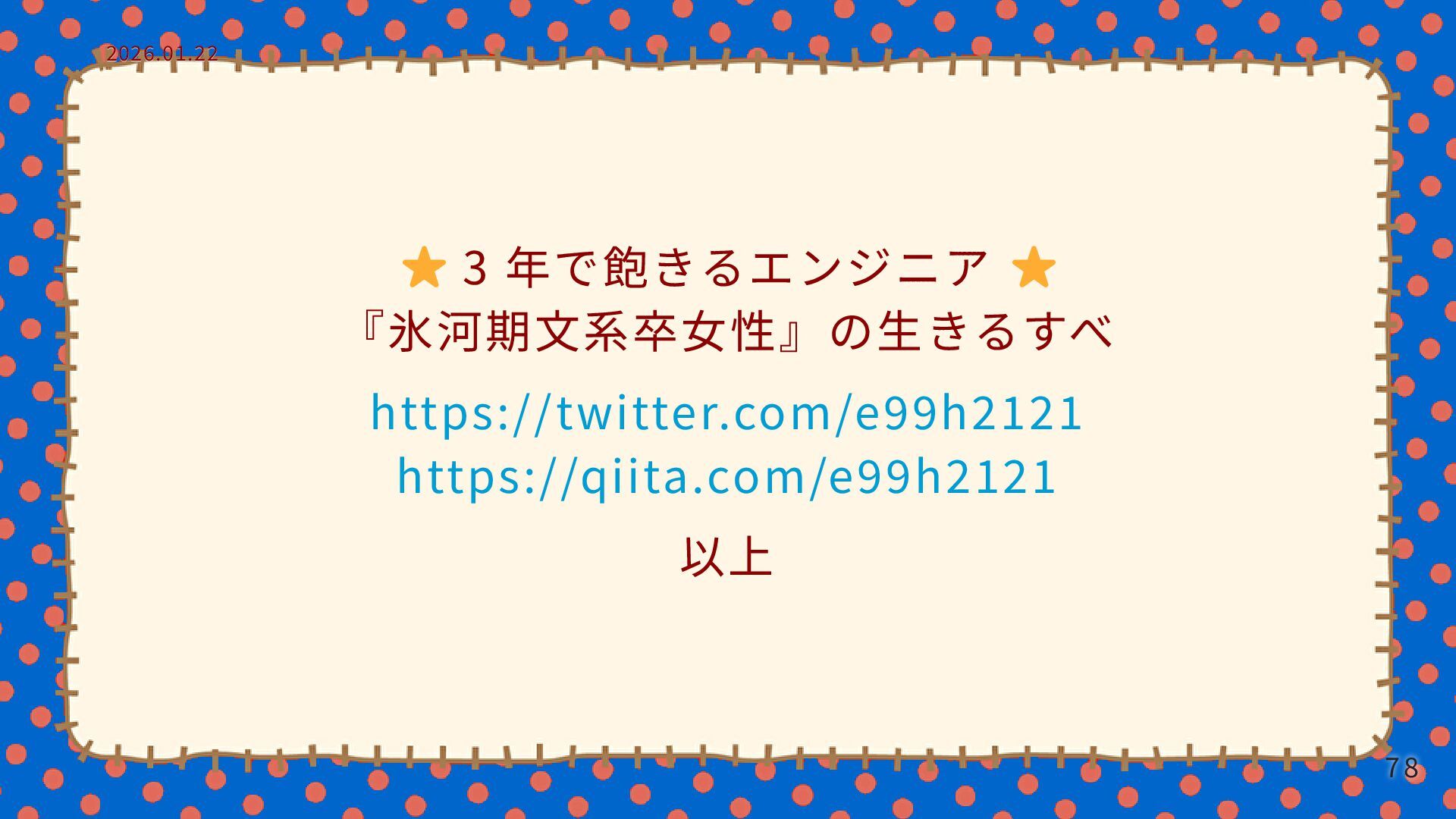 3 年で飽きるエンジニア 『氷河期文系卒女性』の生きるすべ https://twitter.com/e99h2121 https://qiita.com/e99h2121 以上 2026.01.22 2026.01.22 78 78