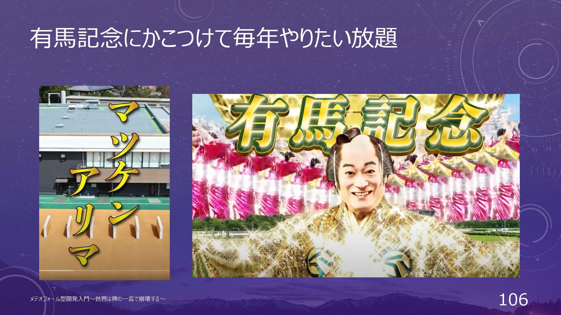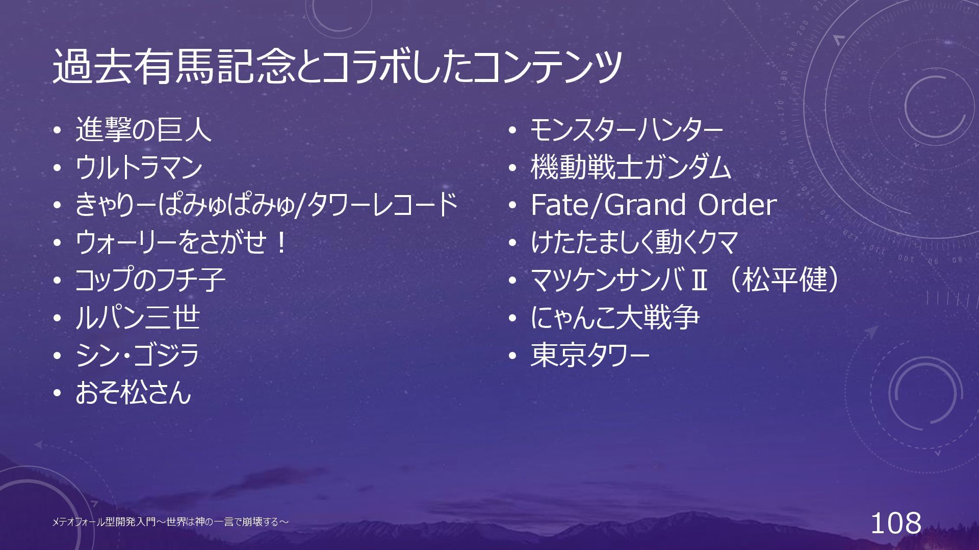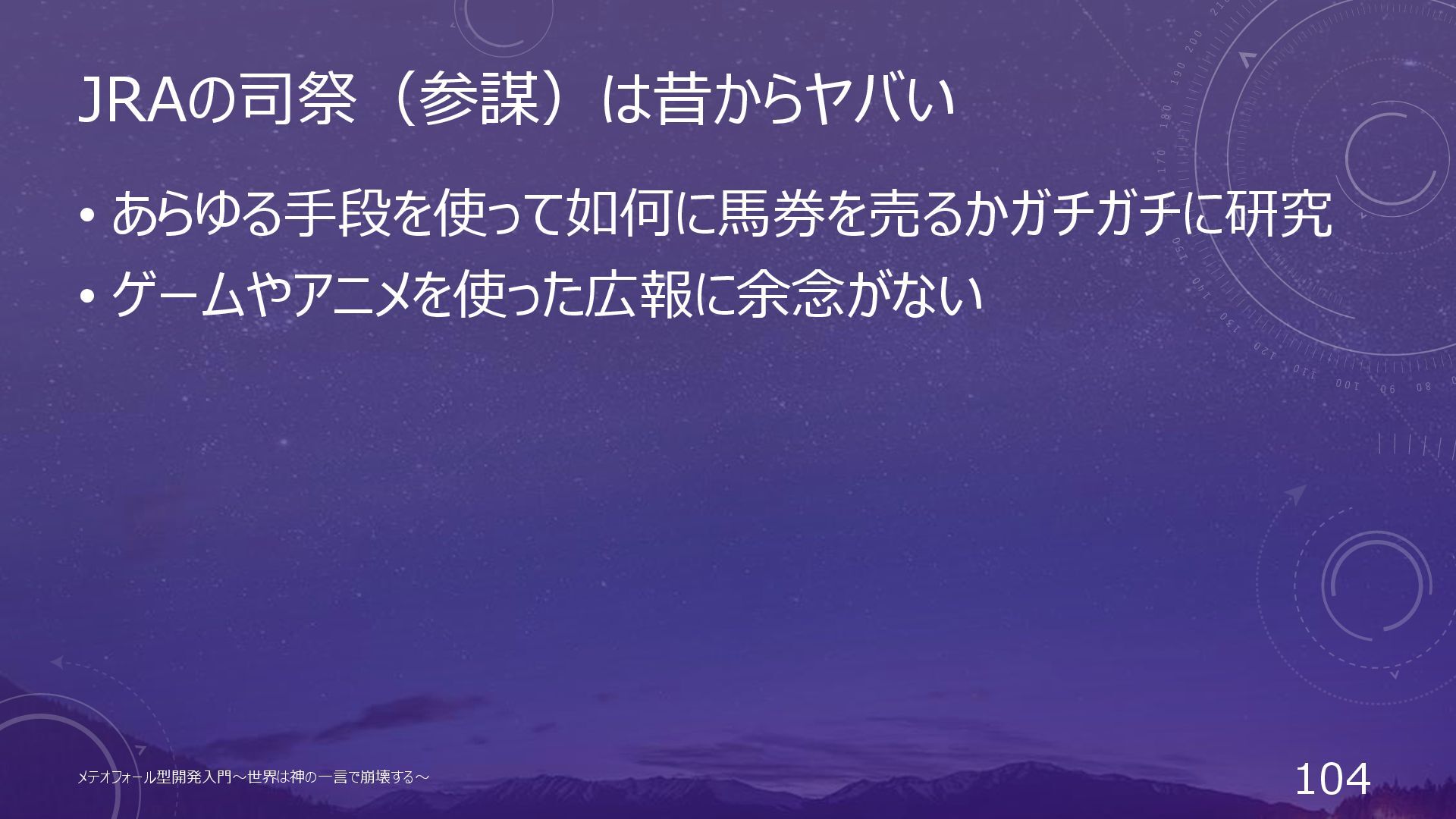 JRAの司祭(参謀)は昔からヤバい • あらゆる手段を使って如何に馬券を売るかガチガチに研究 • ゲームやアニメを使った広報に余念がない メテオフォール型開発入門~世界は神の一言で崩壊する~ 104