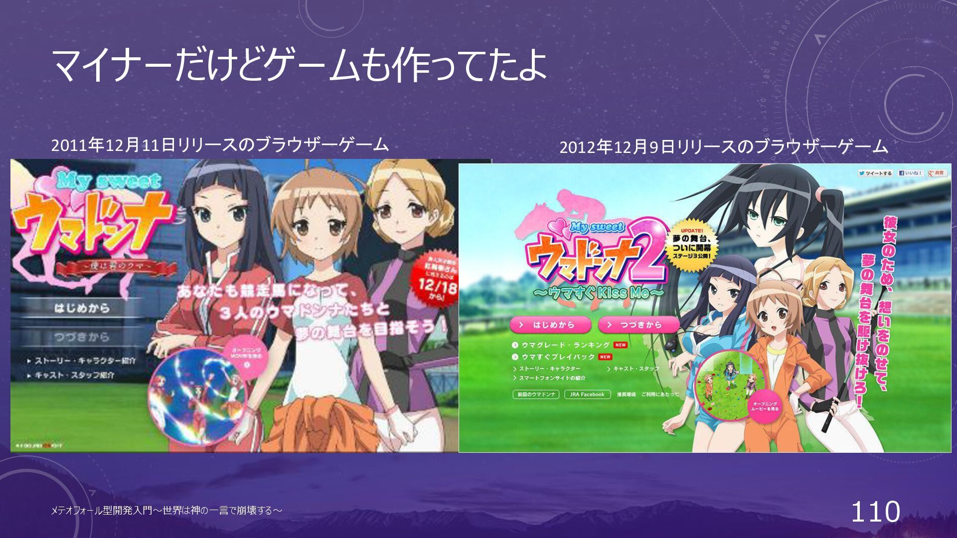 マイナーだけどゲームも作ってたよ メテオフォール型開発入門~世界は神の一言で崩壊する~ 110 2011年12月11日リリースのブラウザーゲーム 2012年12月9日リリースのブラウザーゲーム