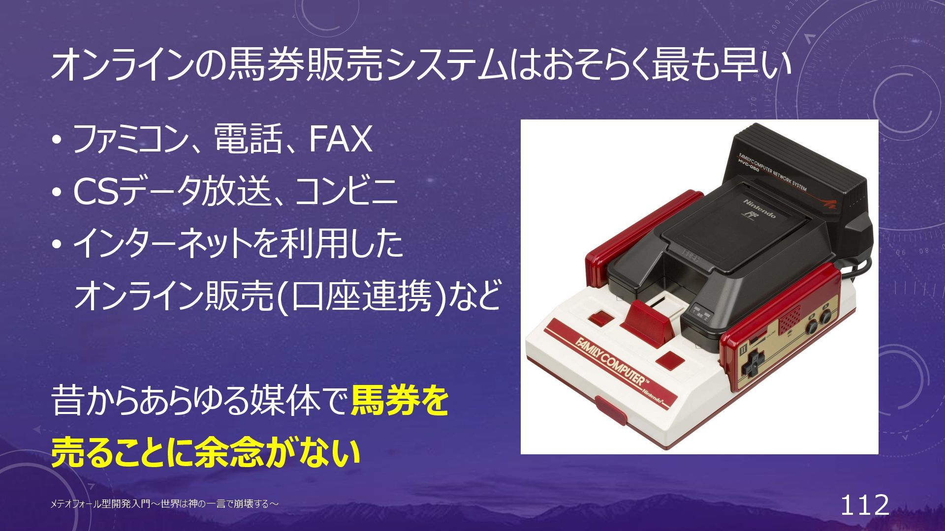 オンラインの馬券販売システムはおそらく最も早い • ファミコン、電話、FAX • CSデータ放送、コンビニ • インターネットを利用した オンライン販売(口座連携)など 昔からあらゆる媒体で馬券を 売ることに余念がない
