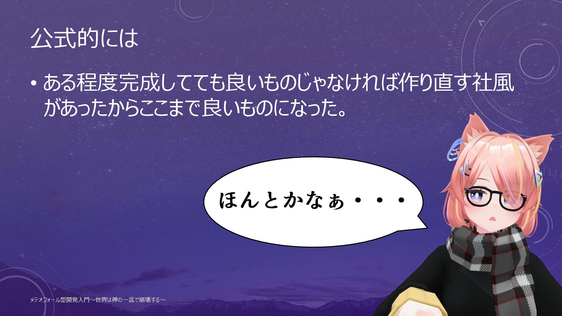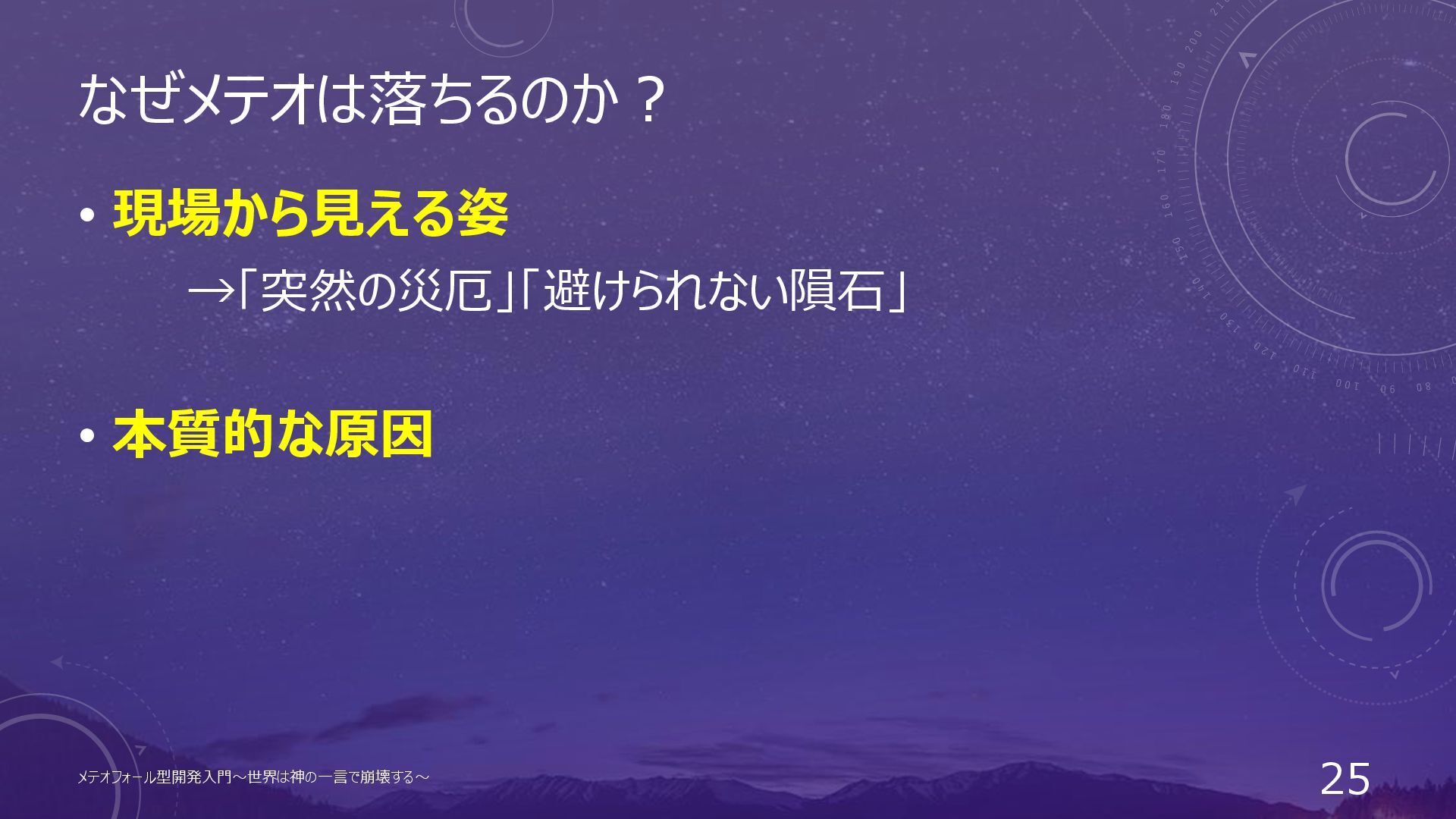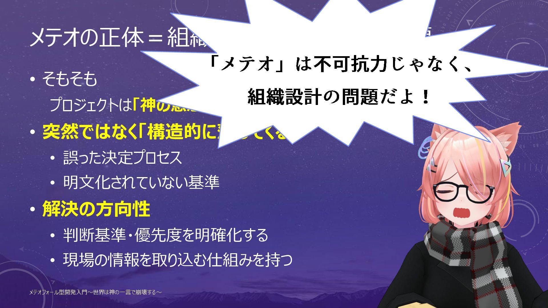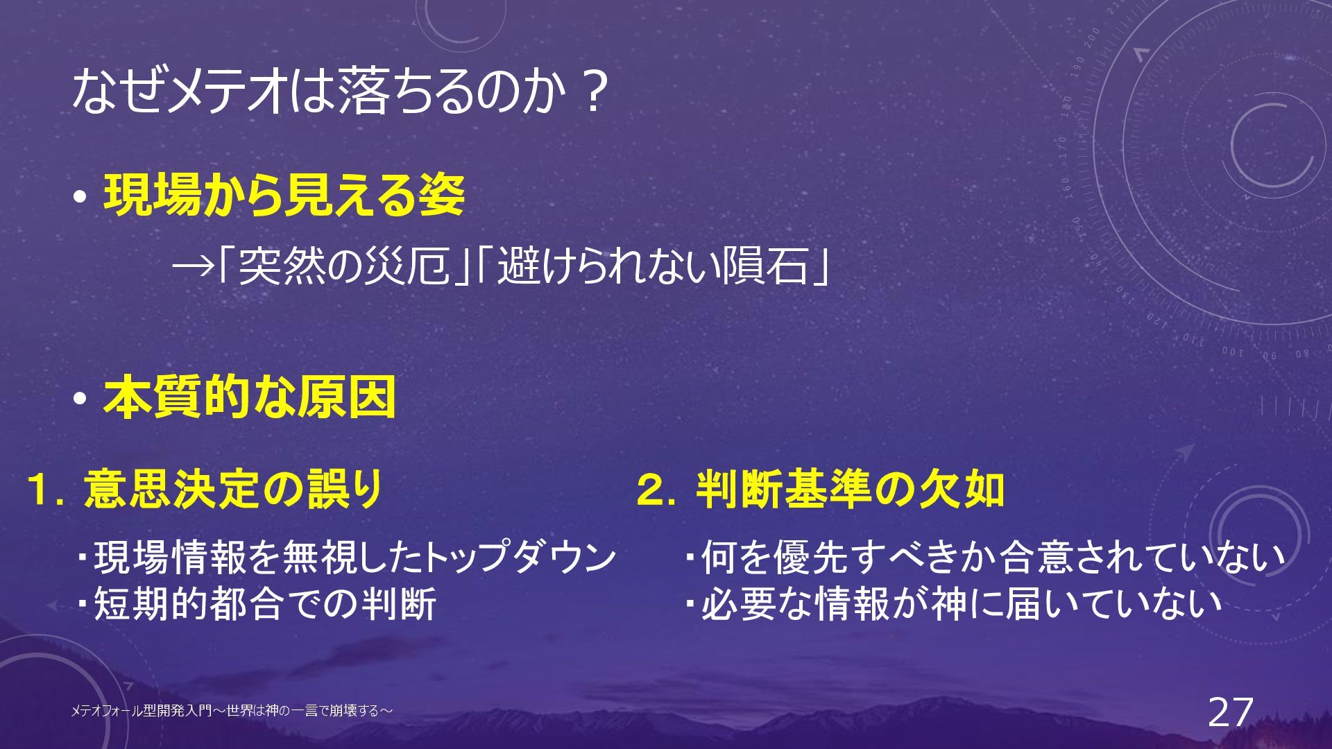 メテオの正体=組織の意思決定構造の問題 • そもそも プロジェクトは「神の意志」を体現するもの • 突然ではなく「構造的に落ちてくる」 • 誤った決定プロセス • 明文化されていない基準