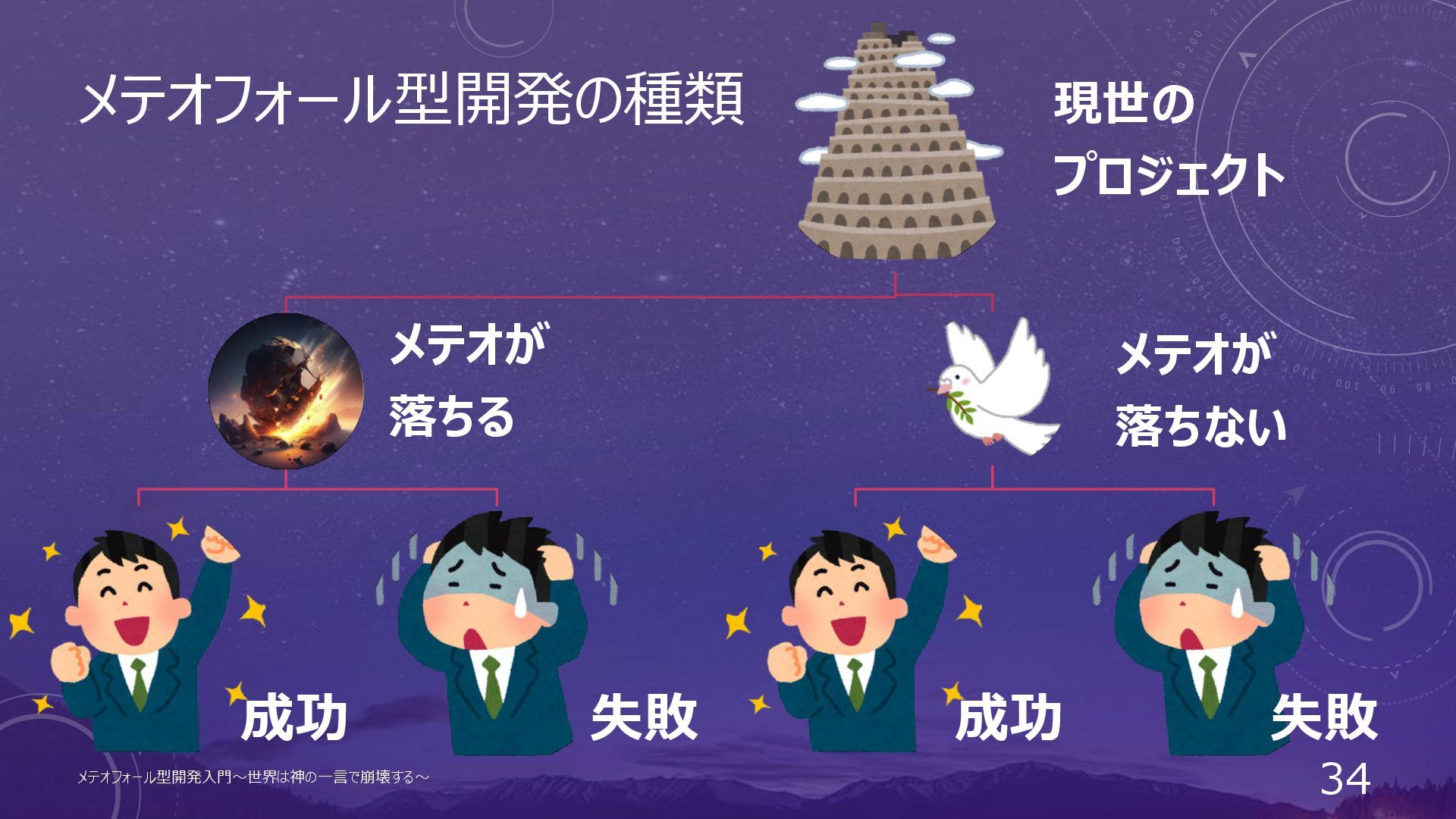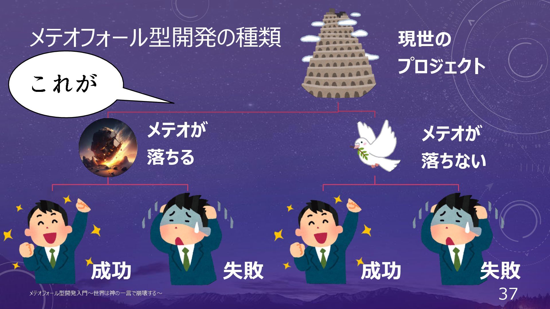 メテオフォール型開発の種類 現世の プロジェクト メテオが 落ちる 成功 失敗 メテオが 落ちない 成功