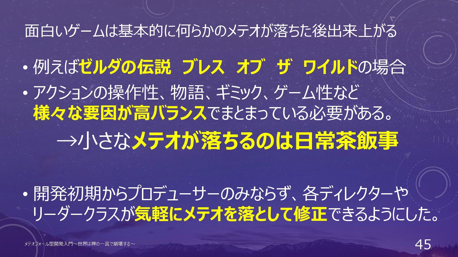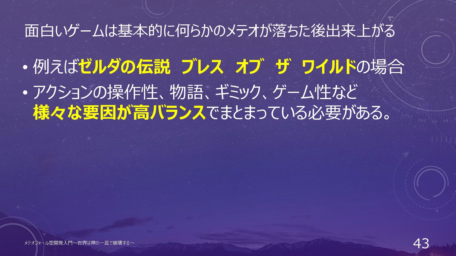 面白いゲームは基本的に何らかのメテオが落ちた後出来上がる • 例えばゼルダの伝説 ブレス オブ ザ ワイルドの場合 • アクションの操作性、物語、ギミック、ゲーム性など 様々な要因が高バランスでまとまっている必要がある。