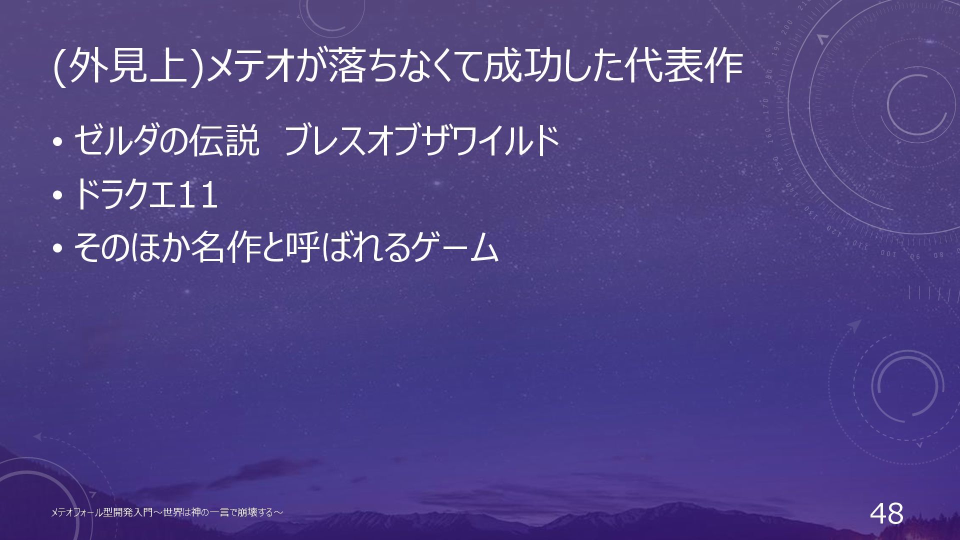 (外見上)メテオが落ちなくて成功した代表作 • ゼルダの伝説 ブレスオブザワイルド • ドラクエ11 • そのほか名作と呼ばれるゲーム メテオフォール型開発入門~世界は神の一言で崩壊する~ 48