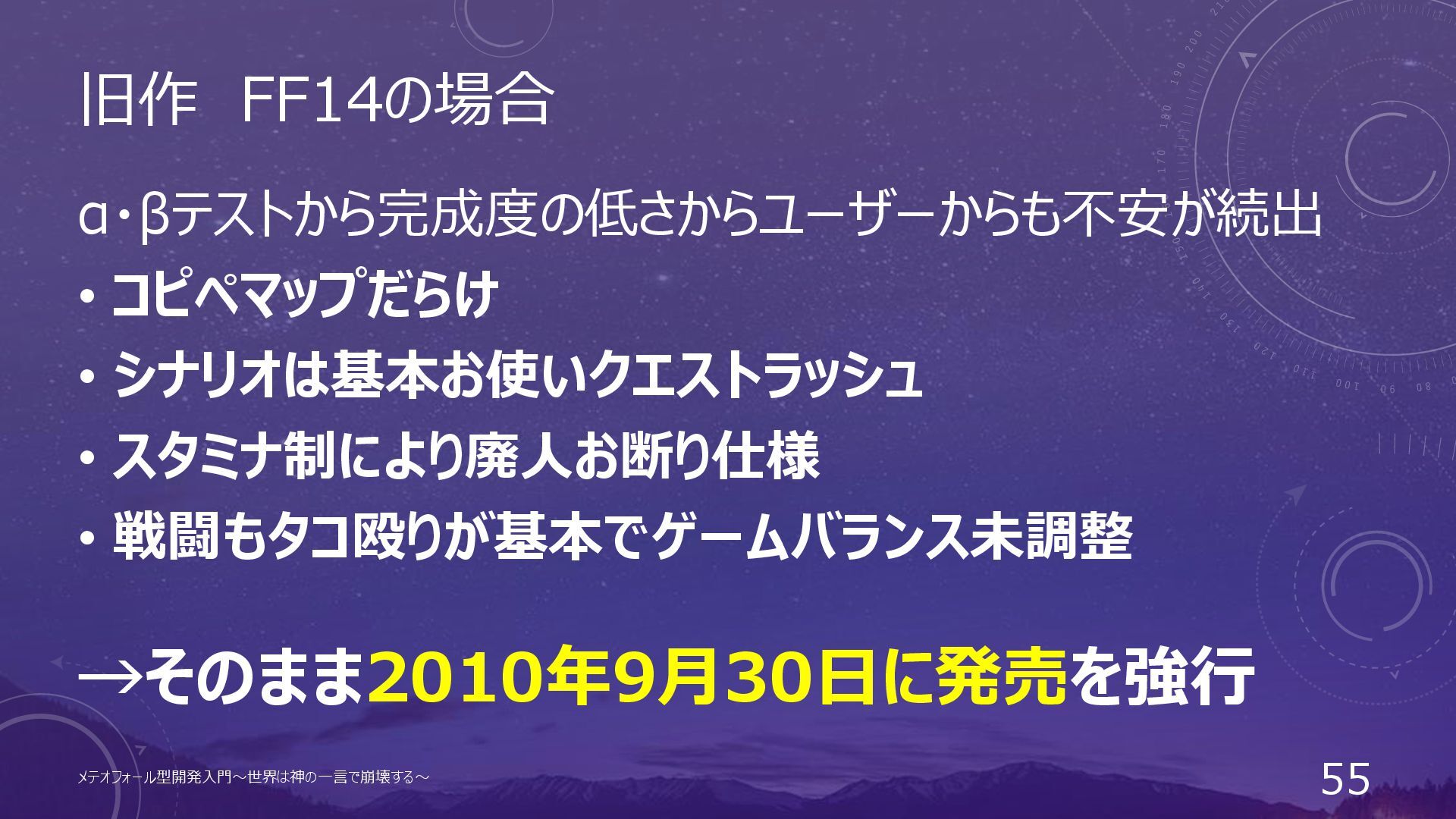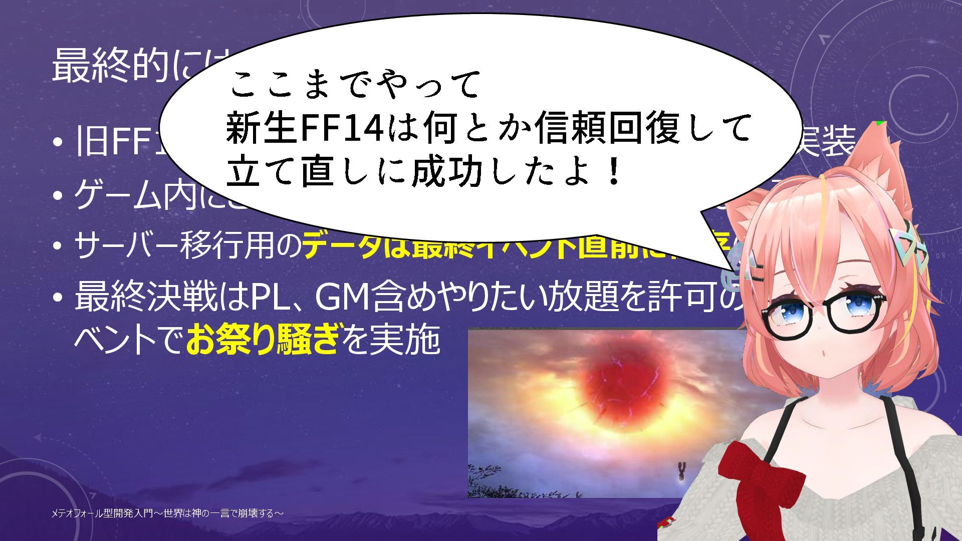 物理的にメテオが落ちて成功した例 (新生FF14) メテオフォール型開発入門~世界は神の一言で崩壊する~ 54