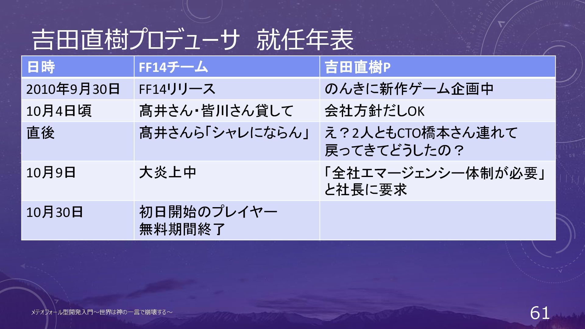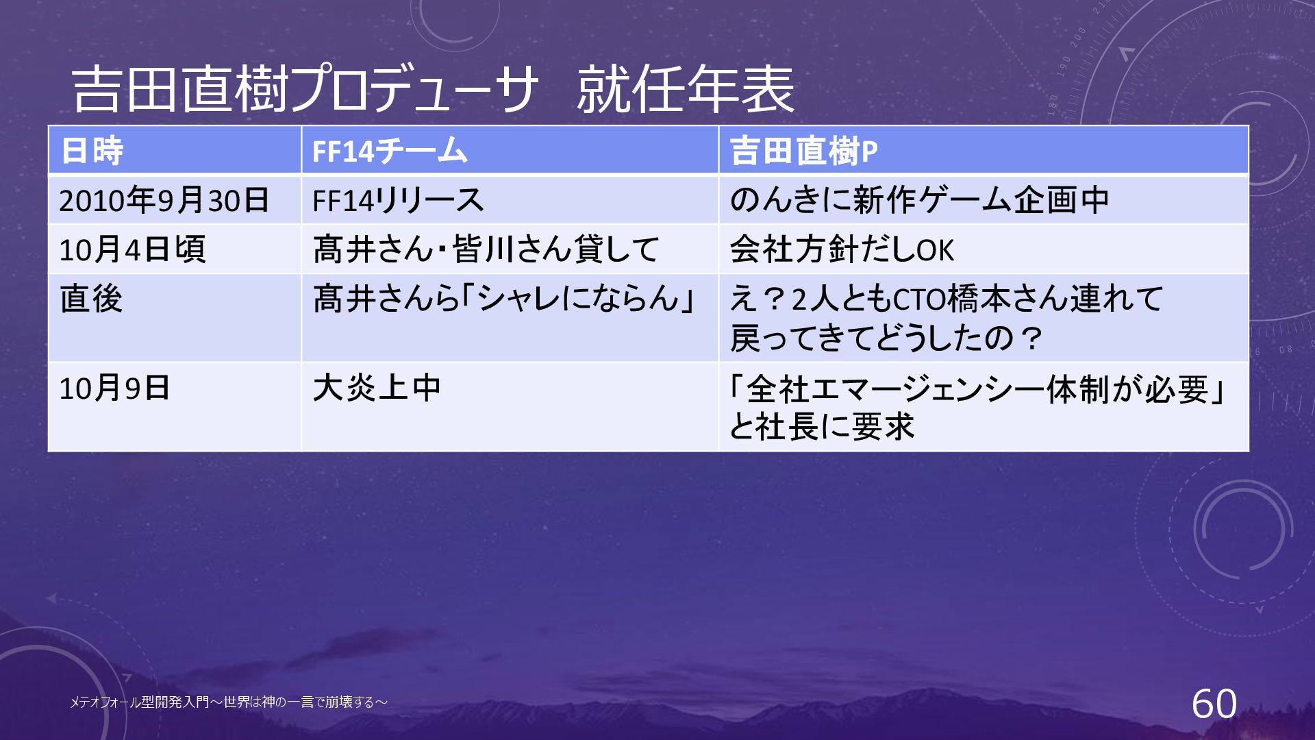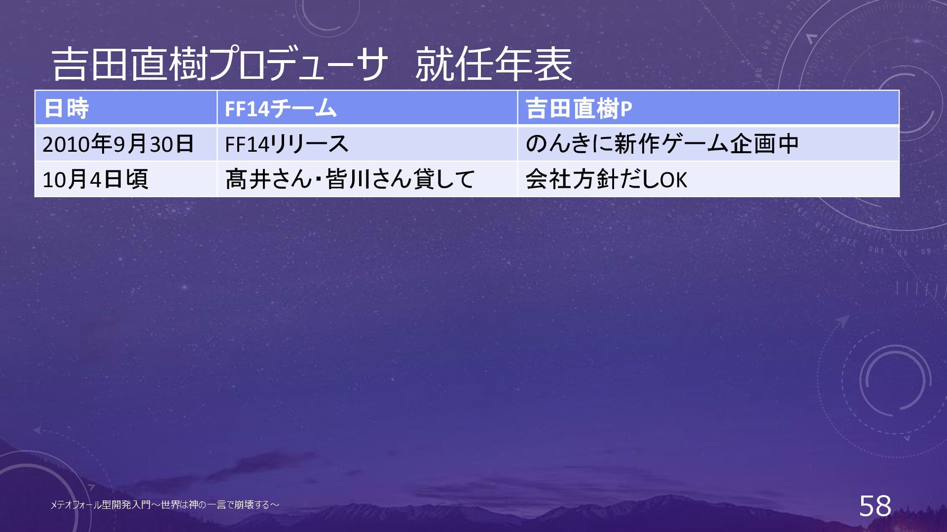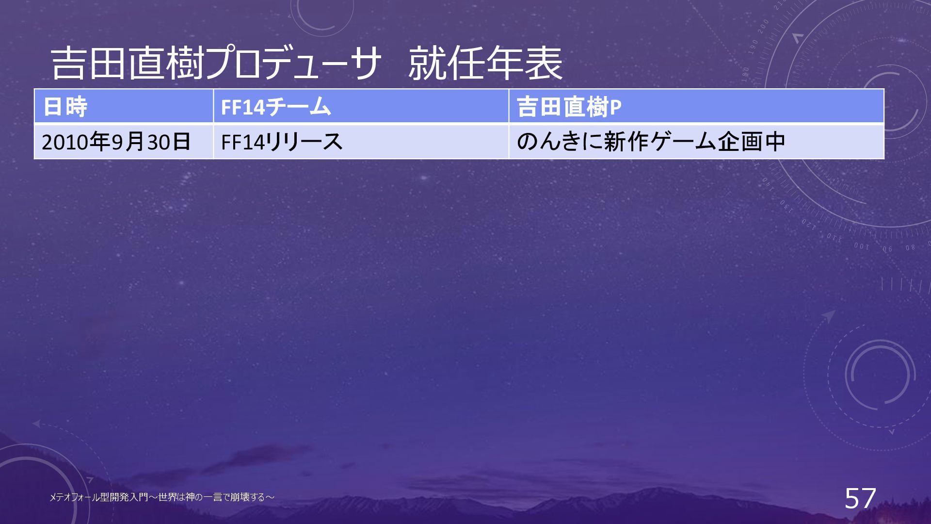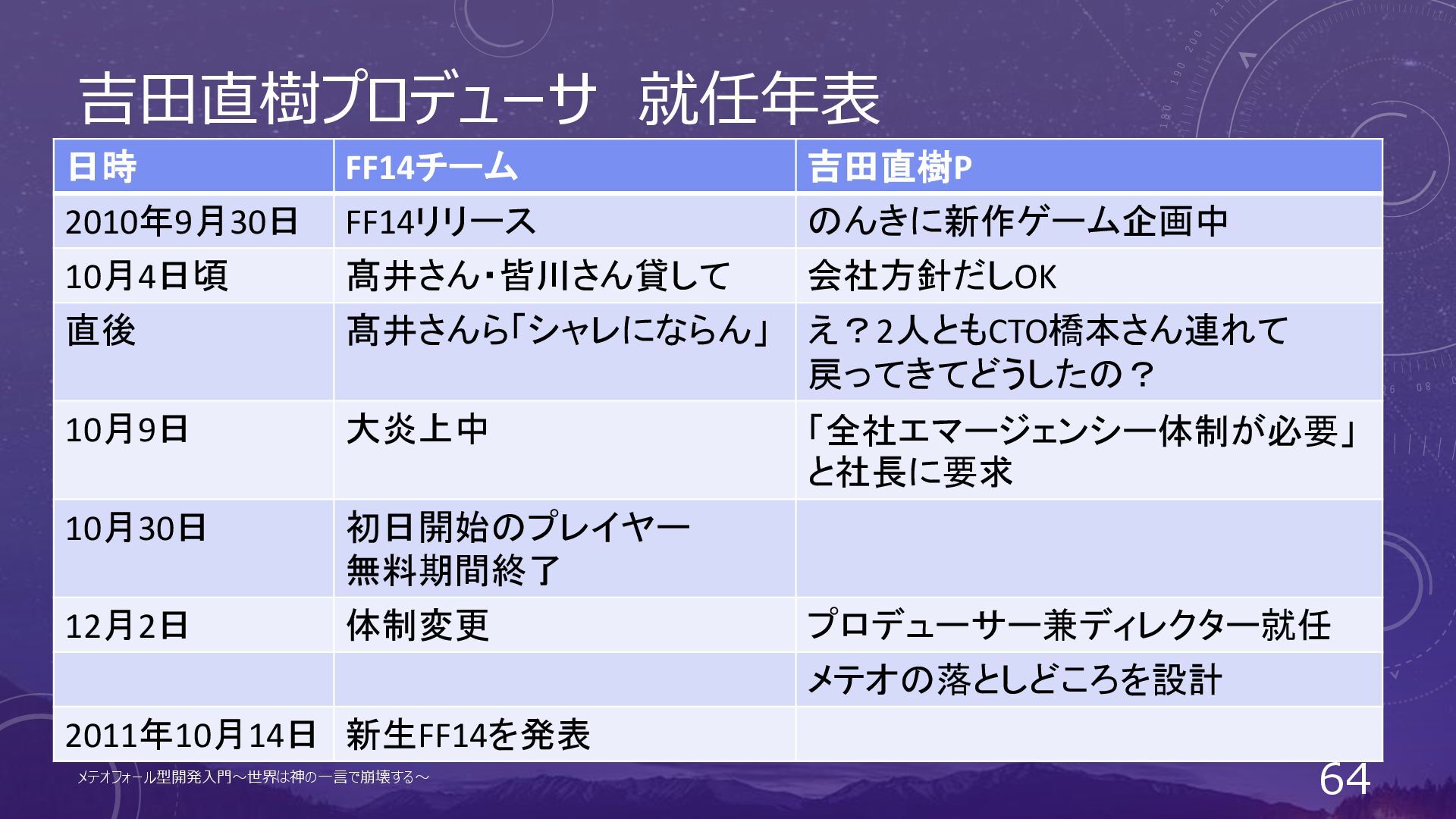 吉田直樹プロデューサ 就任年表 日時 FF14チーム 吉田直樹P 2010年9月30日 FF14リリース のんきに新作ゲーム企画中 メテオフォール型開発入門~世界は神の一言で崩壊する~ 57