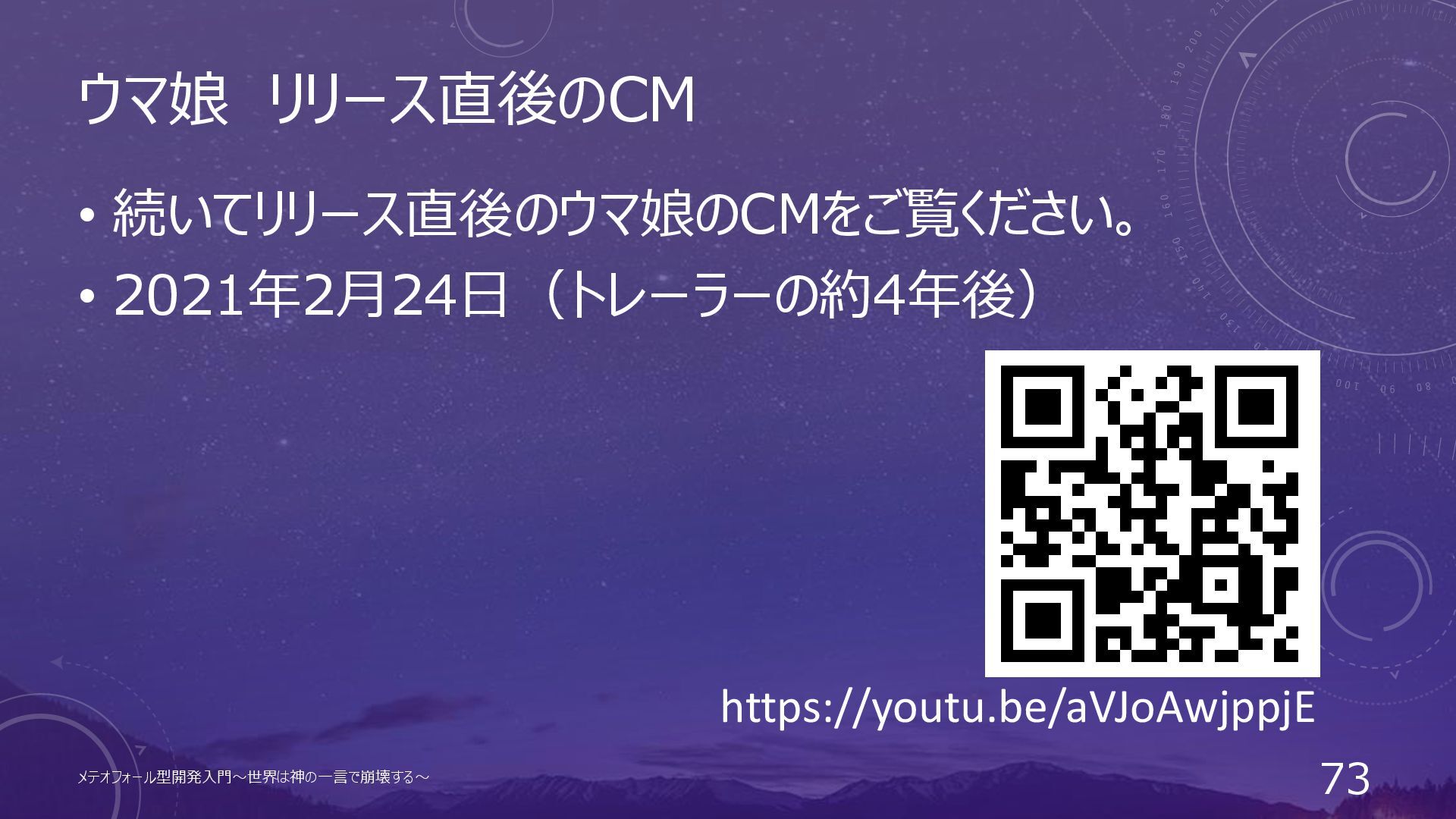 ウマ娘 リリース直後のCM • 続いてリリース直後のウマ娘のCMをご覧ください。 • 2021年2月24日(トレーラーの約4年後) メテオフォール型開発入門~世界は神の一言で崩壊する~ 73 https://youtu.be/aVJoAwjppjE