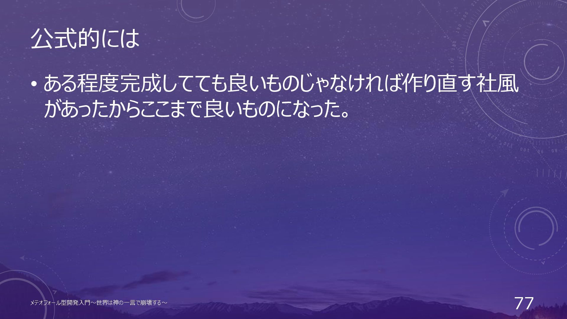 公式的には • ある程度完成してても良いものじゃなければ作り直す社風 があったからここまで良いものになった。 メテオフォール型開発入門~世界は神の一言で崩壊する~ 77